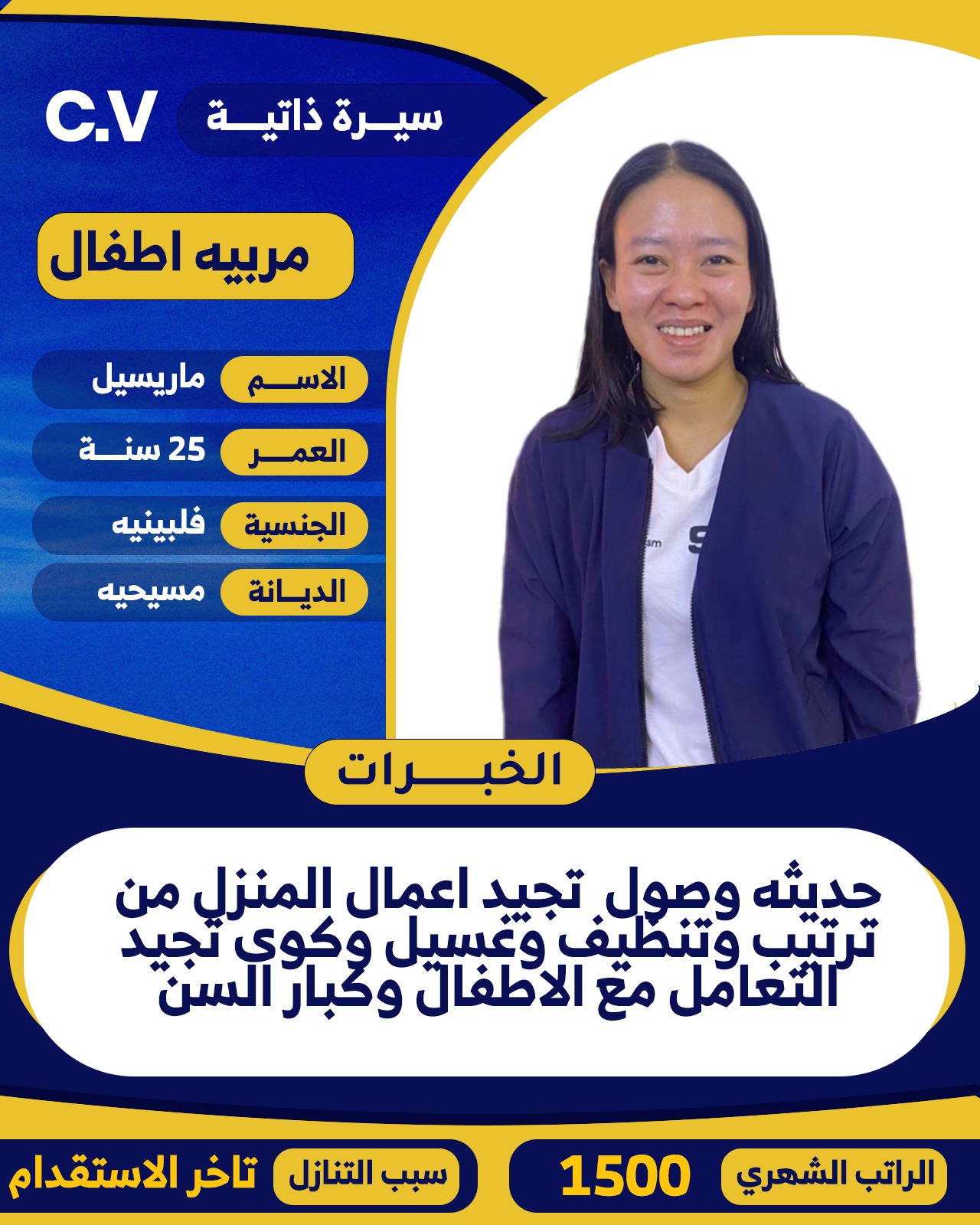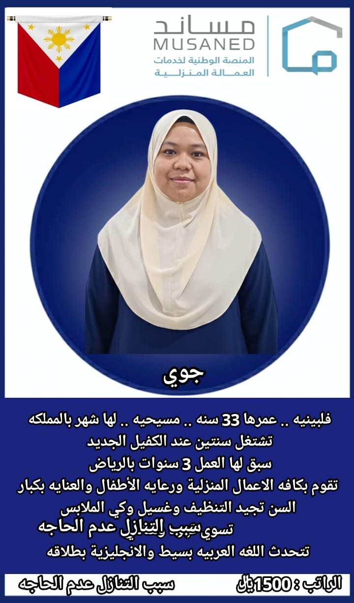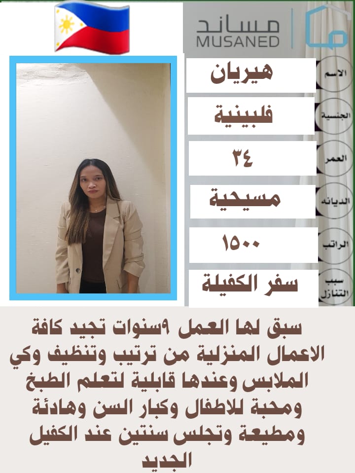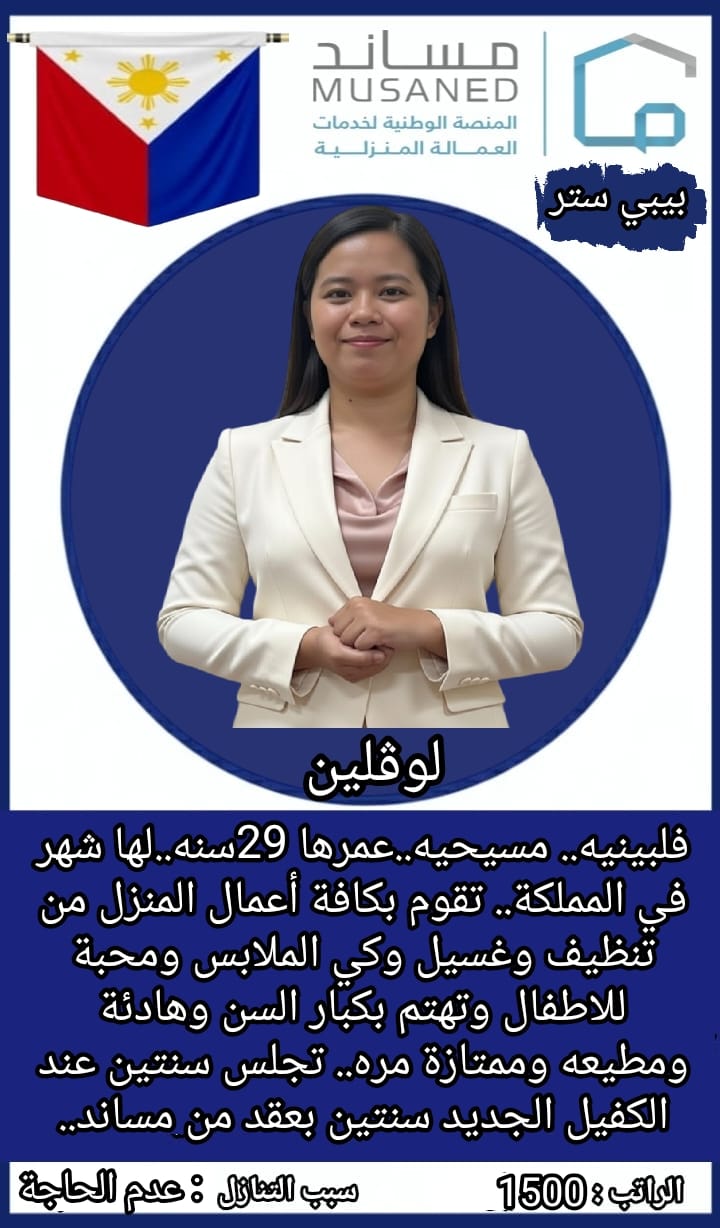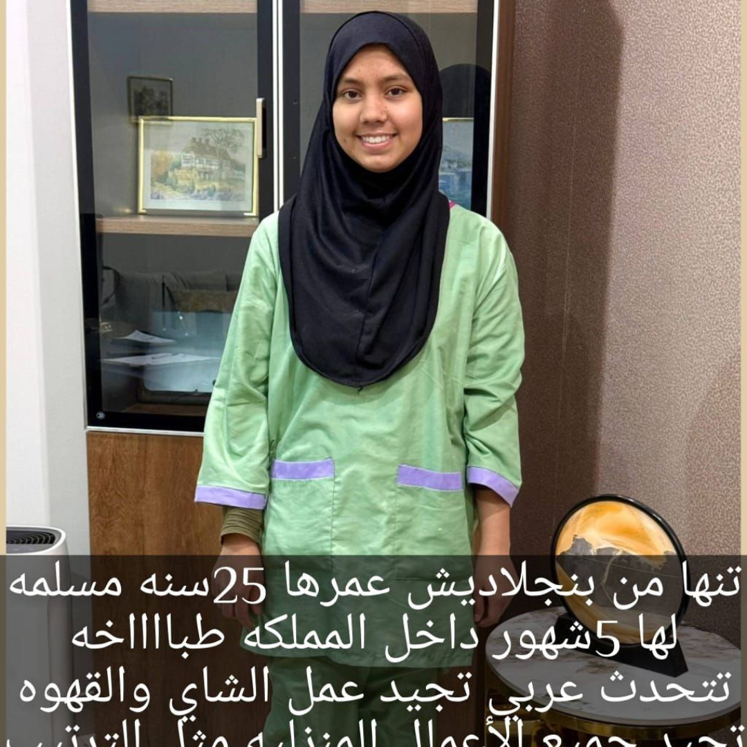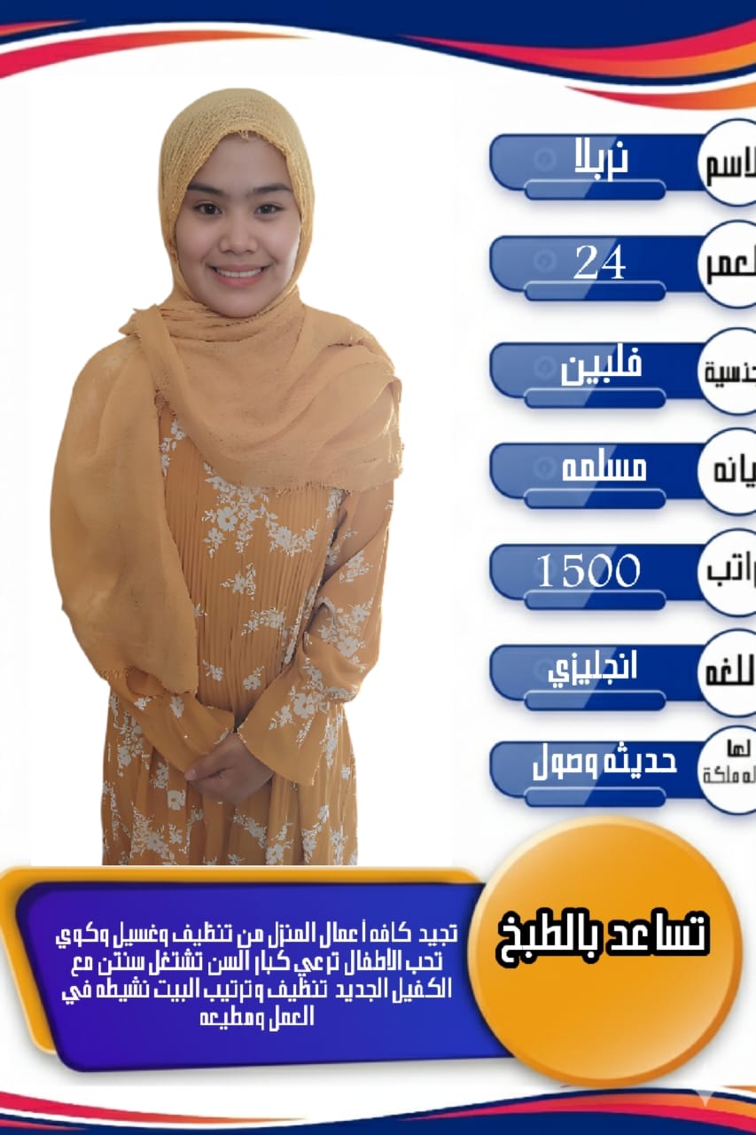 فلبينيه مسلمه لها ثلاثه أشهر فقط وتجلس سنتين عمرها ٢٦سنه تجيد كافه اعمال المنزل