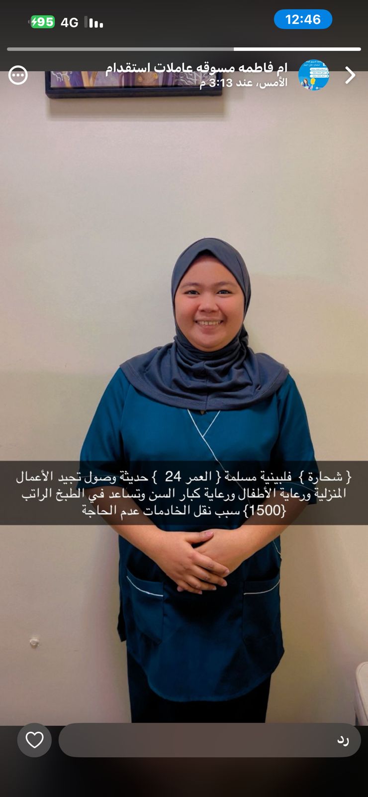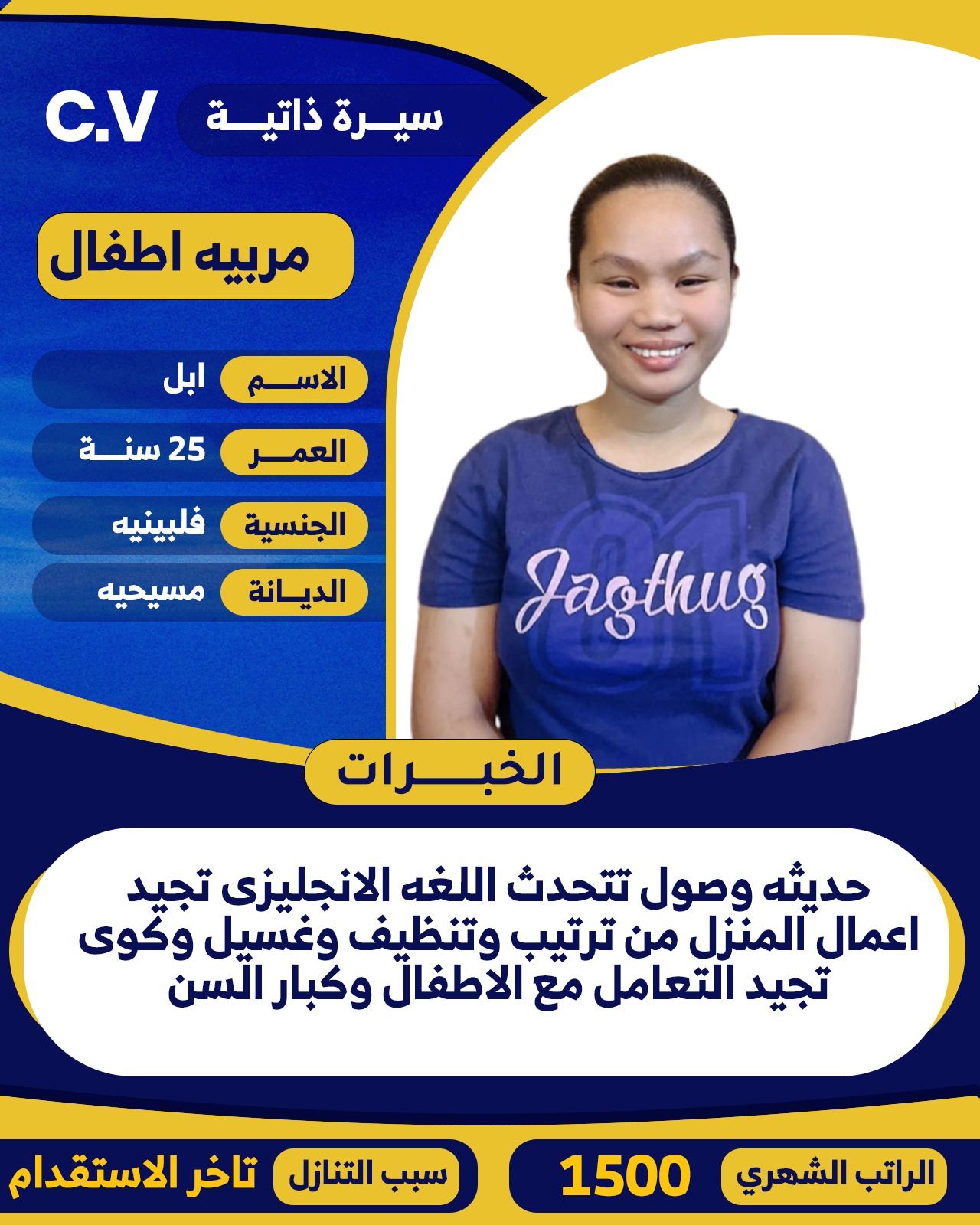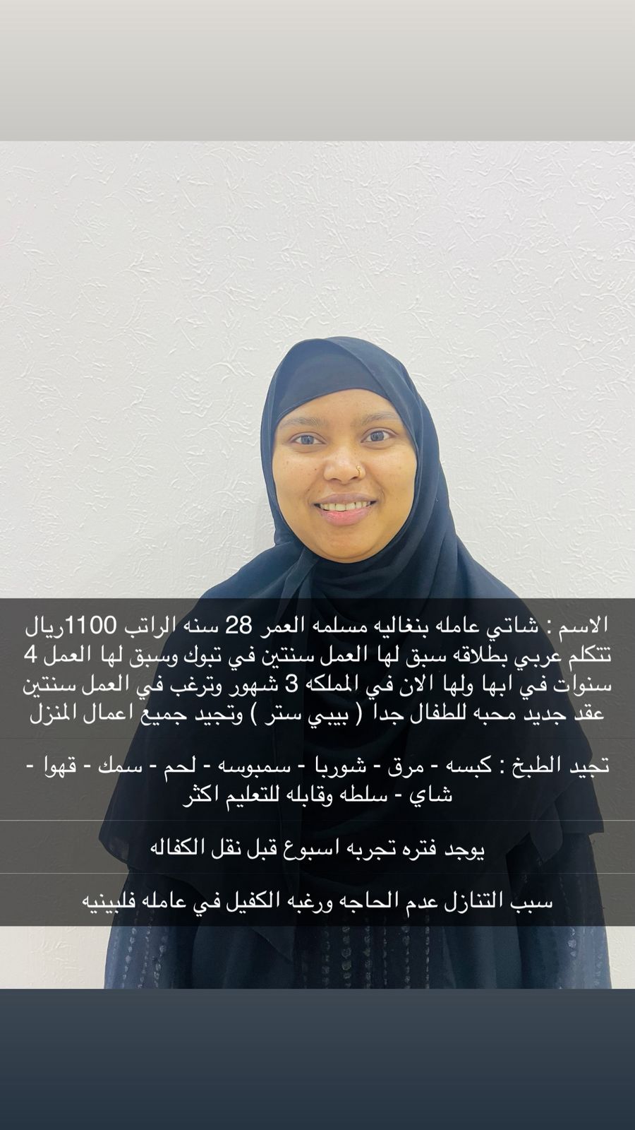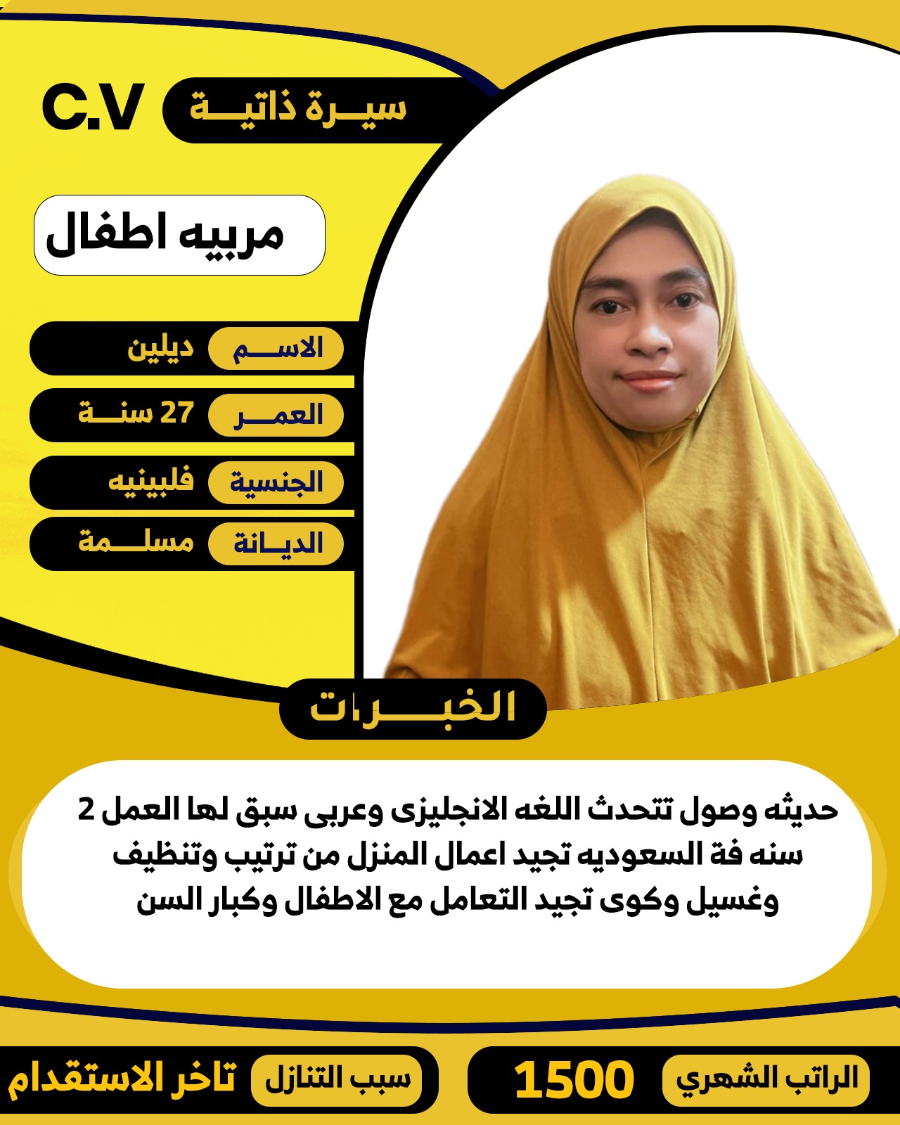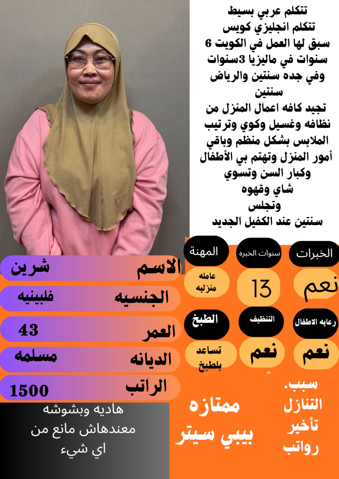 فلبينيه مسلمه لها ثلاثه أشهر فقط وتجلس سنتين عمرها ٢٦سنه تجيد كافه اعمال المنزل