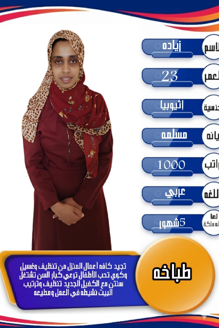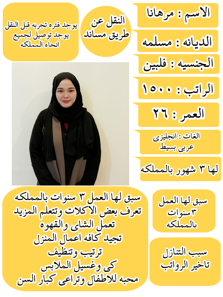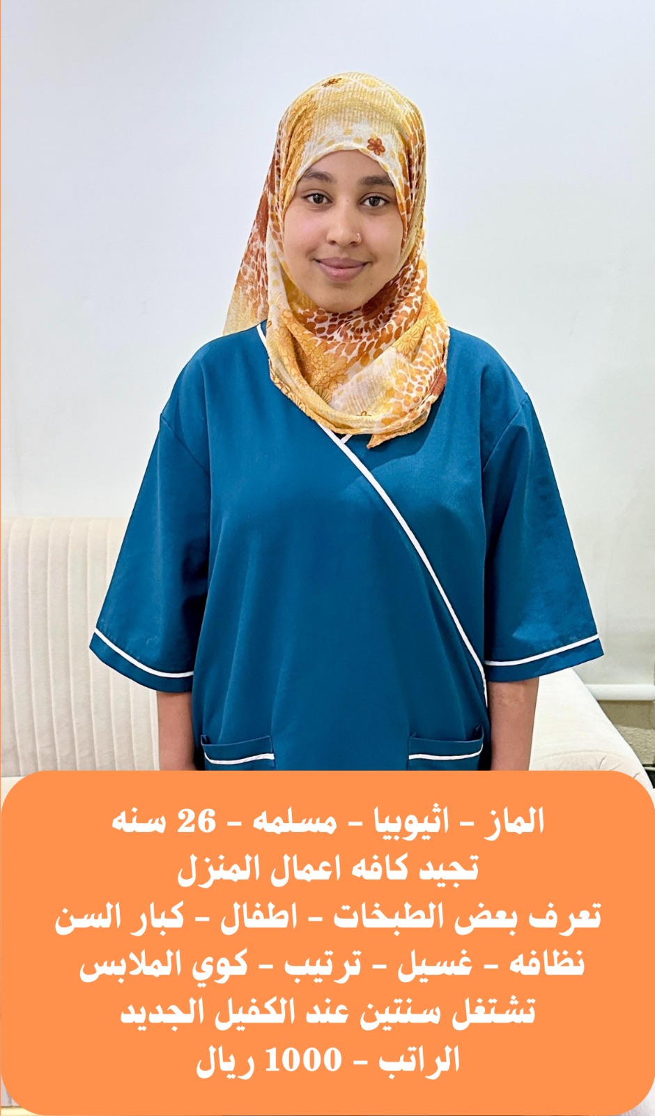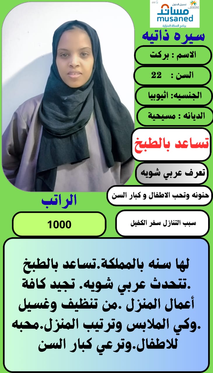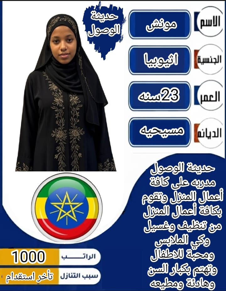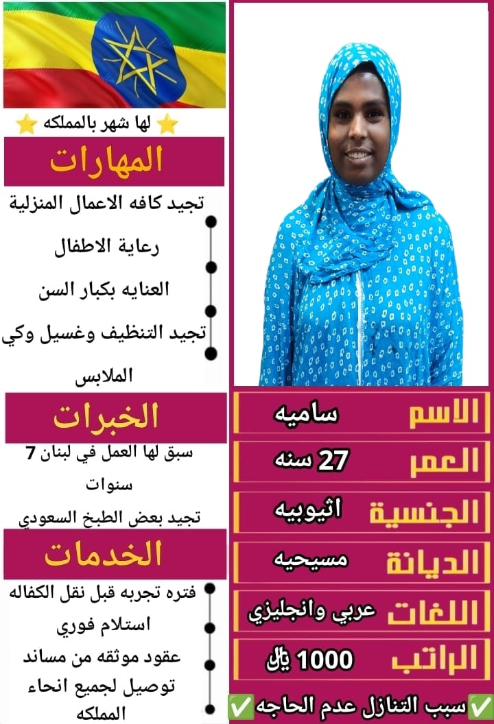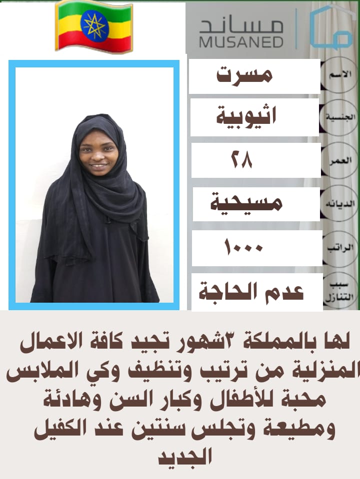 مهيرت ..اثيوبيا .. العمر:31.. الراتب 1000.. تجيد الاعمال المنزليه ..محبه للاطفال وكبار السن ..تتحدث انقلش بسيط …سبب التنازل :سوء المعامله من الكفيل السابق