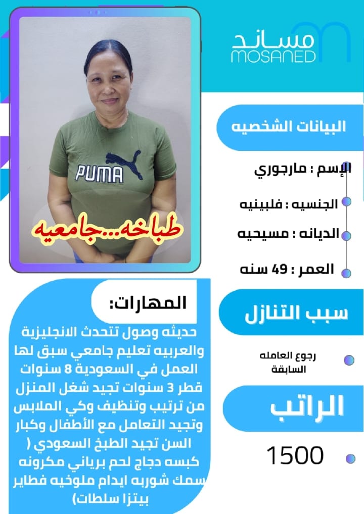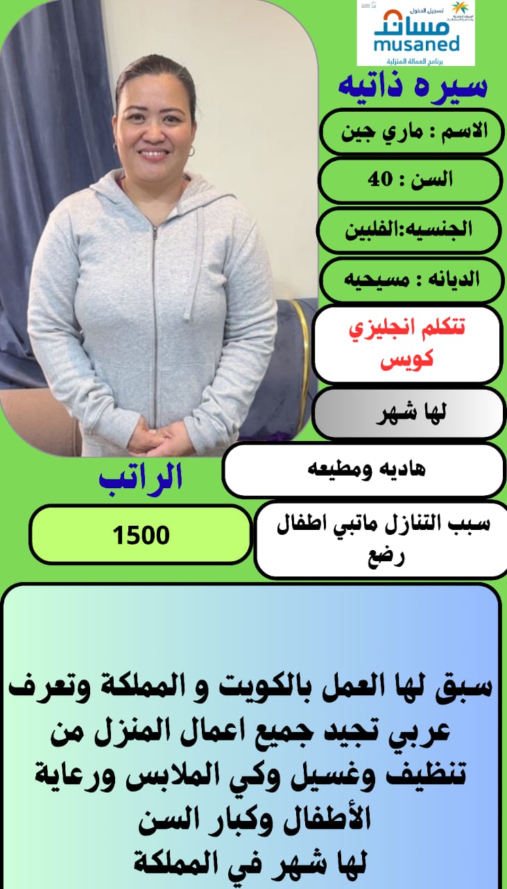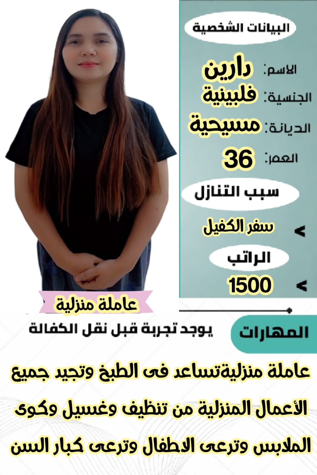 فلبينية ممتازة تجيد جميع اعمال المنزل ومراعاة كبار السن ورعاية الأطفال الراتب1500 السعر مناسب