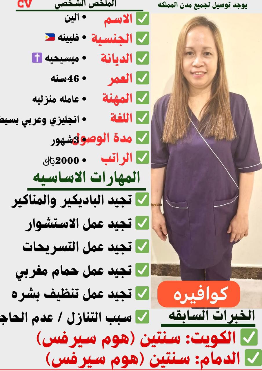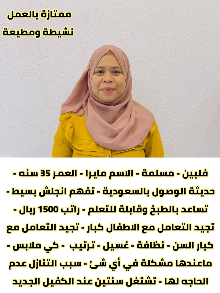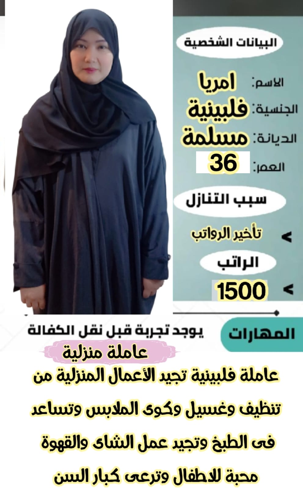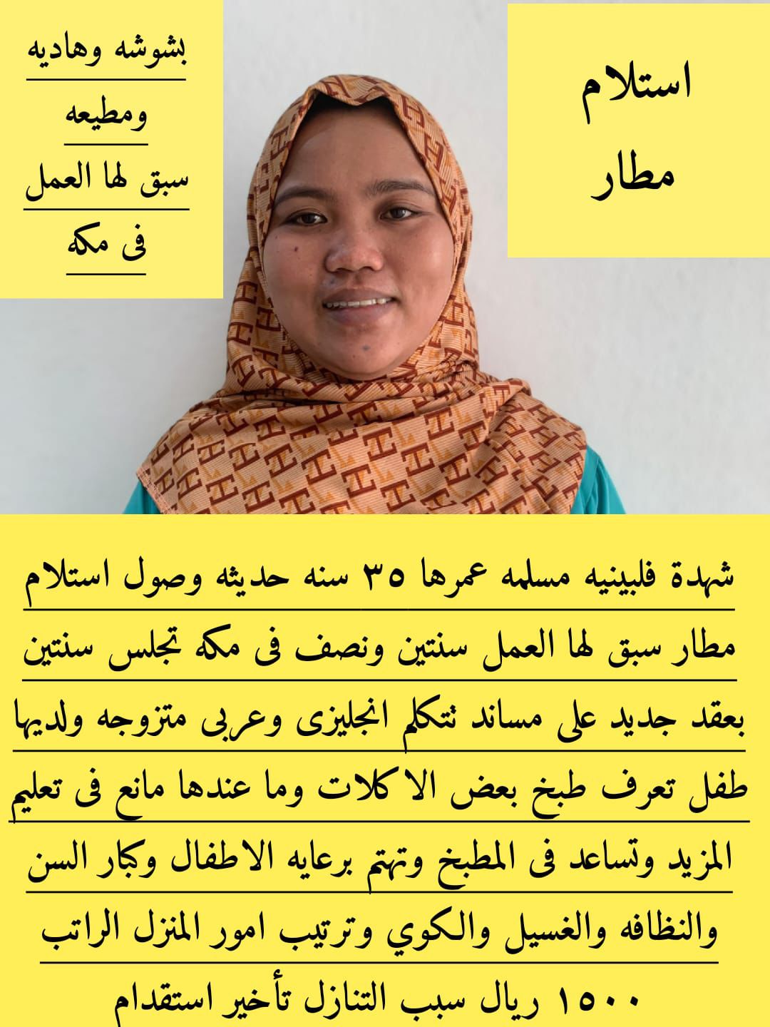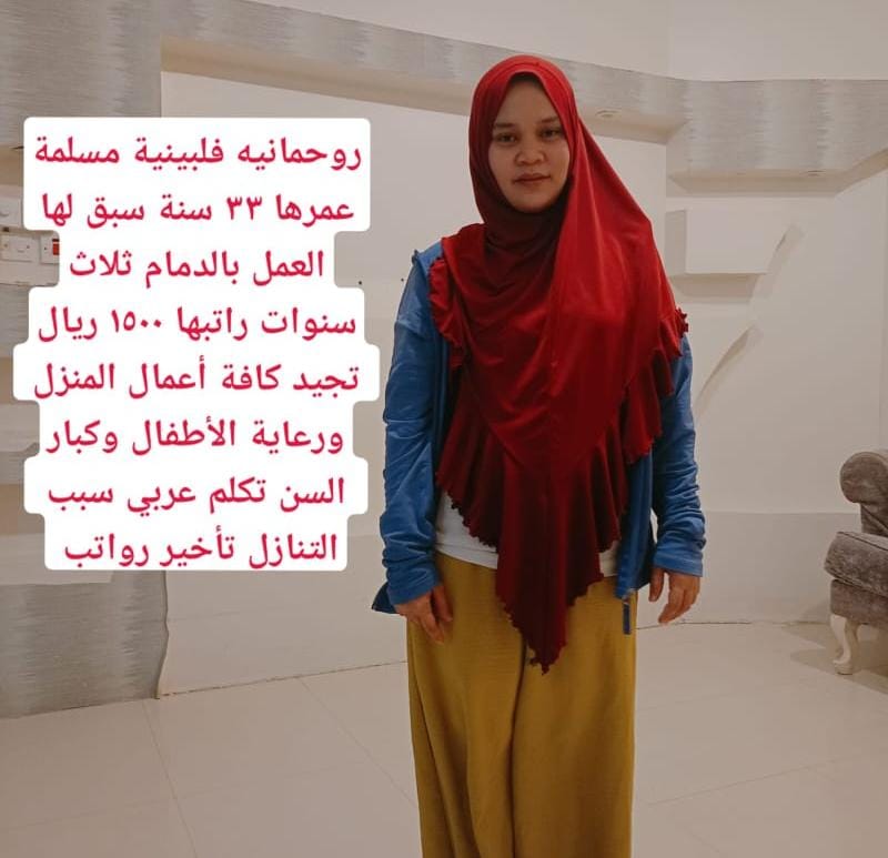 عامله منزليه من الفلبين لتنازل عمرها ٢٨سنه مسلمه خبره ٦سنوات بالمدينه سنتين والطائف سنتين وقطر سنتين