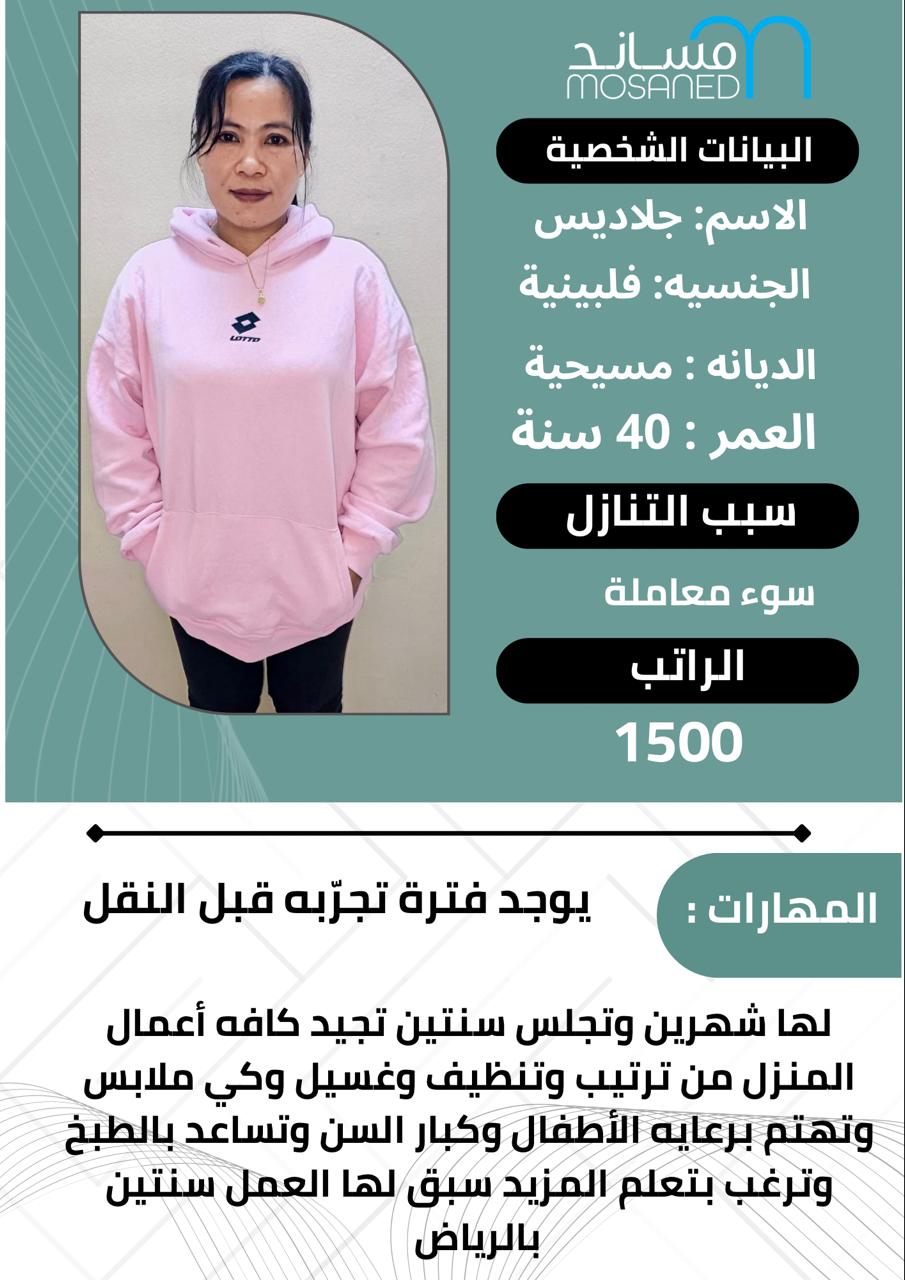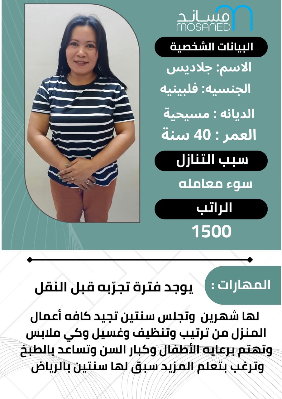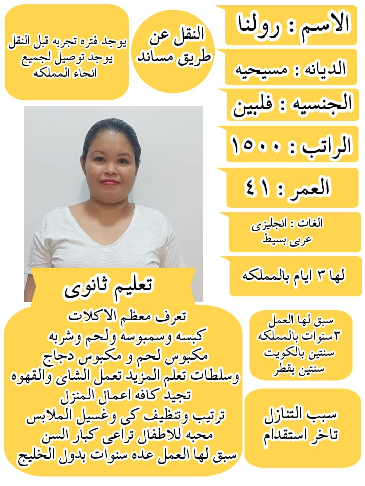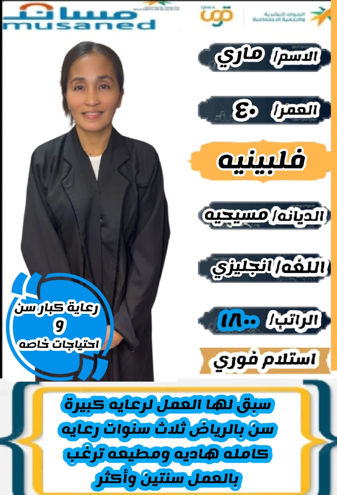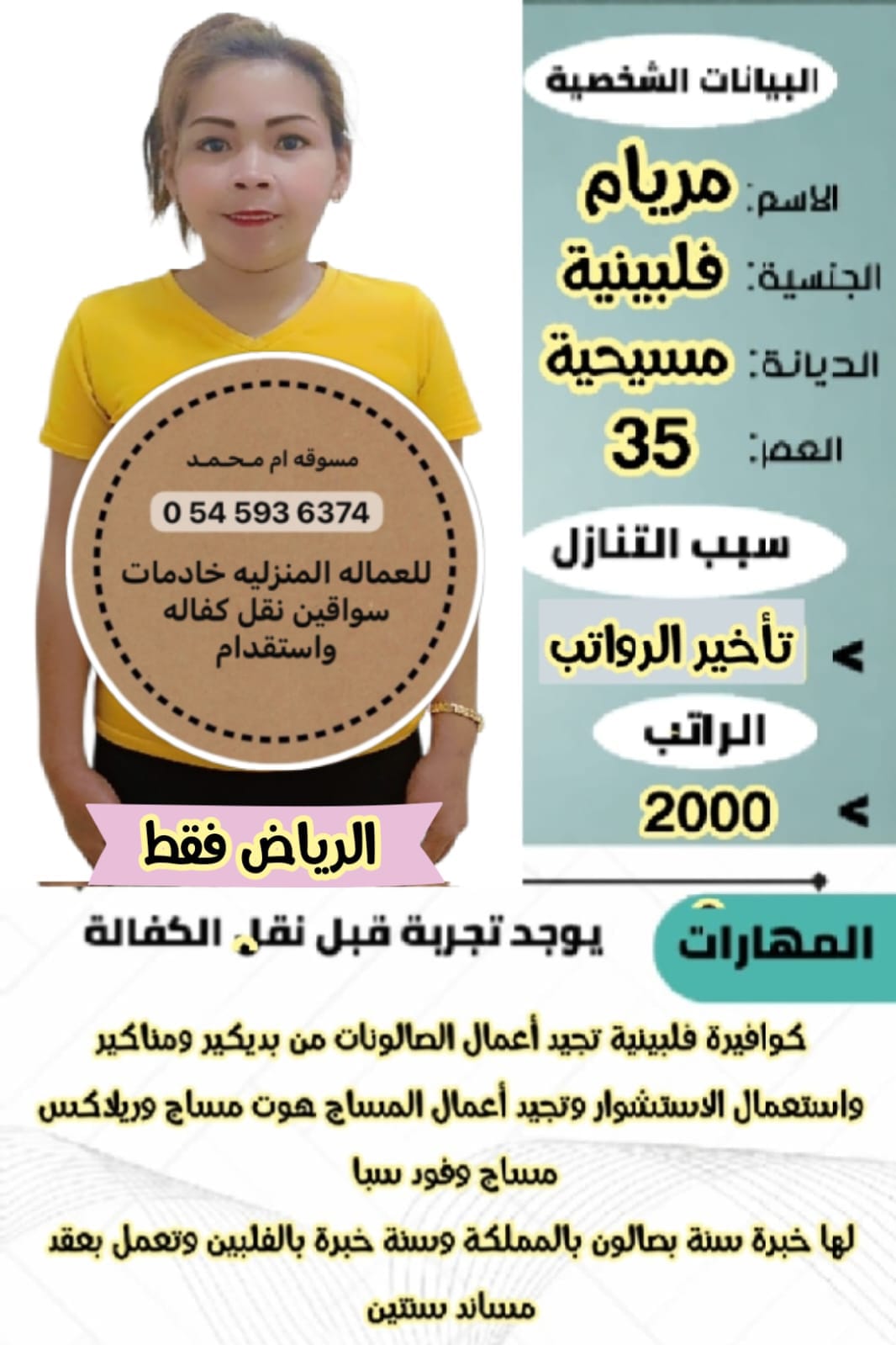 عامله منزليه من الفلبين لتنازل عمرها ٢٨سنه مسلمه خبره ٦سنوات بالمدينه سنتين والطائف سنتين وقطر سنتين