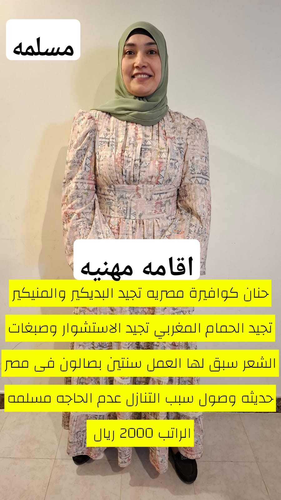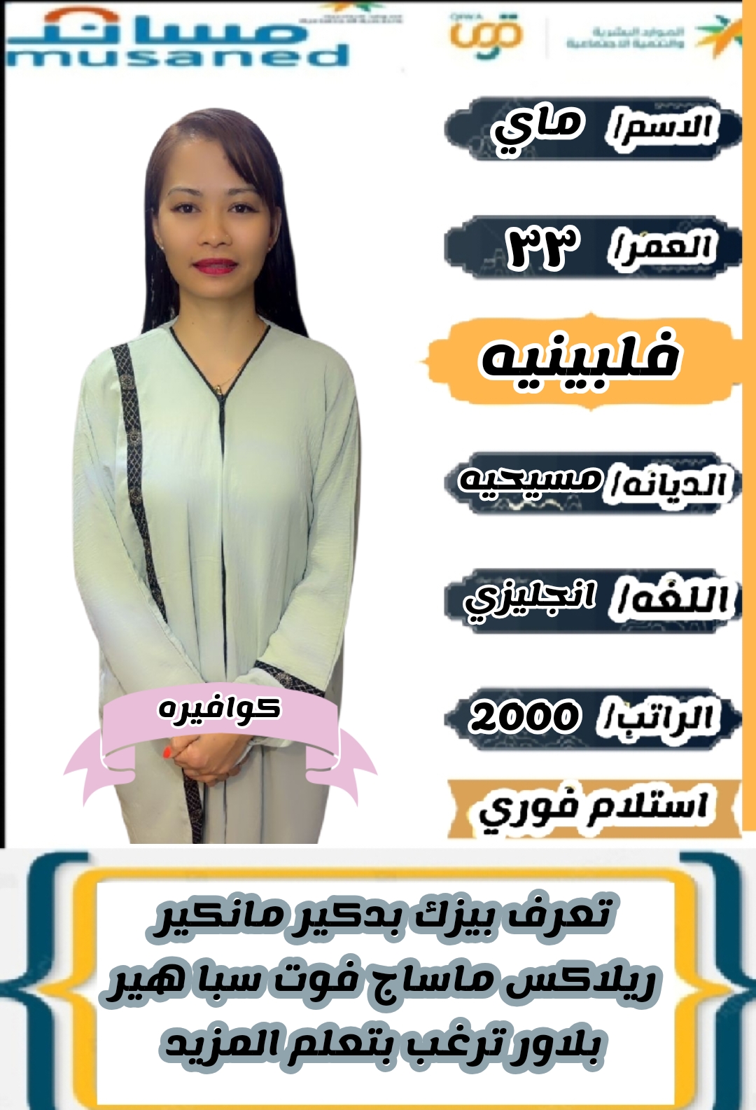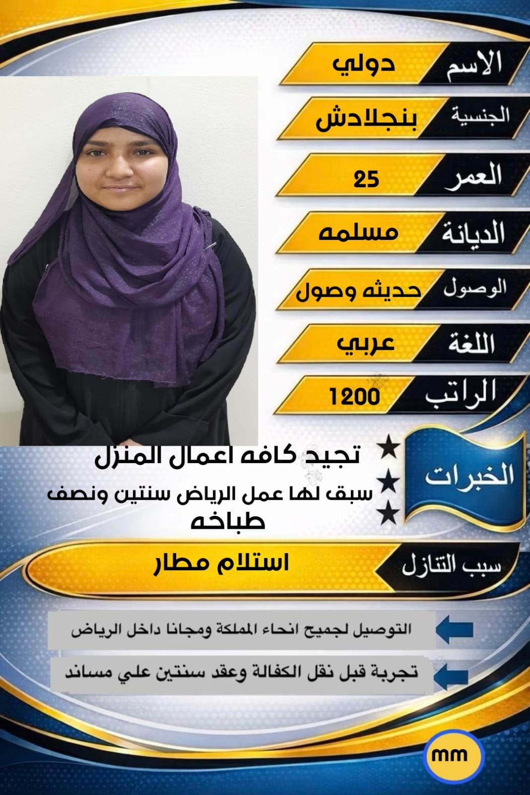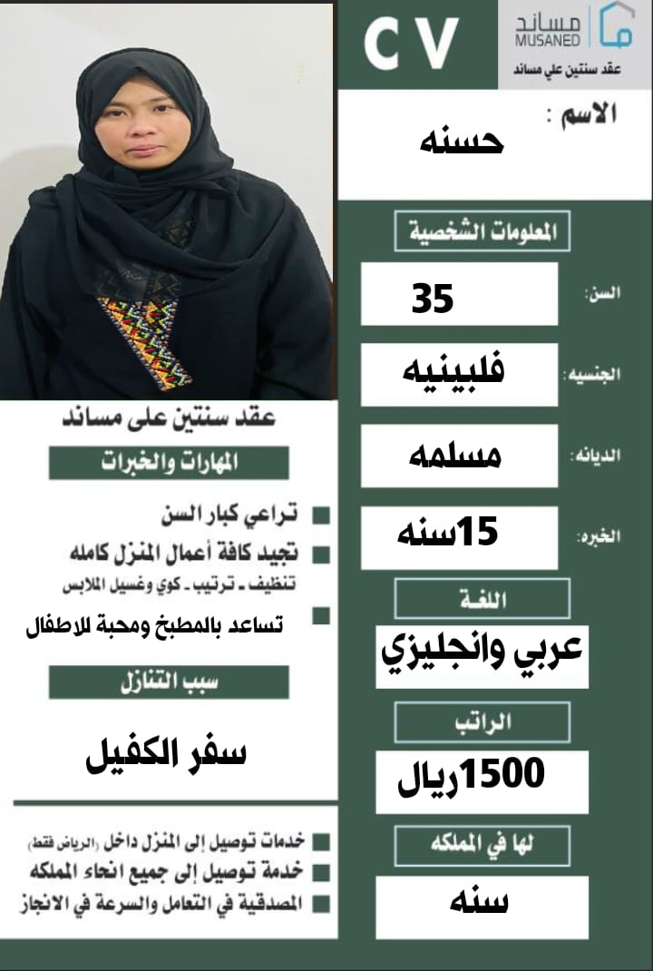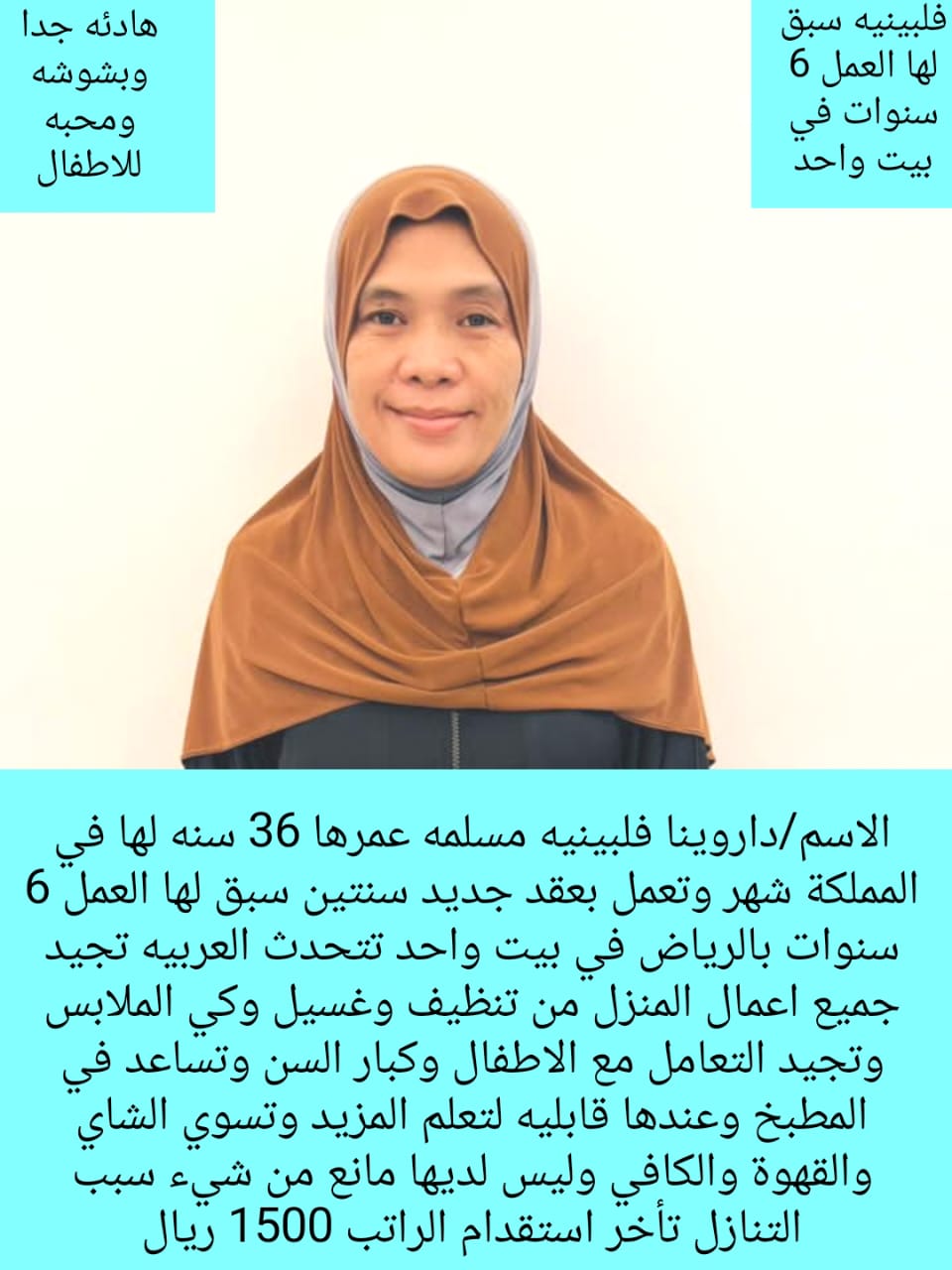 عامله منزليه من الفلبين لتنازل عمرها ٢٨سنه مسلمه خبره ٦سنوات بالمدينه سنتين والطائف سنتين وقطر سنتين