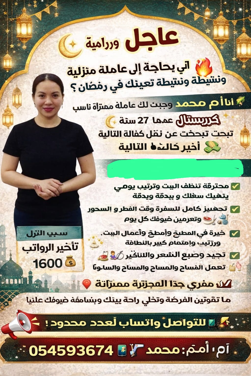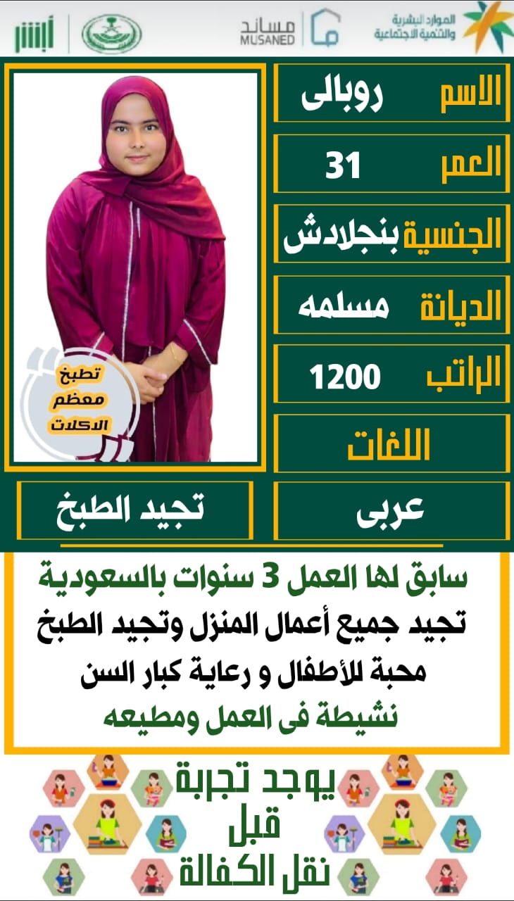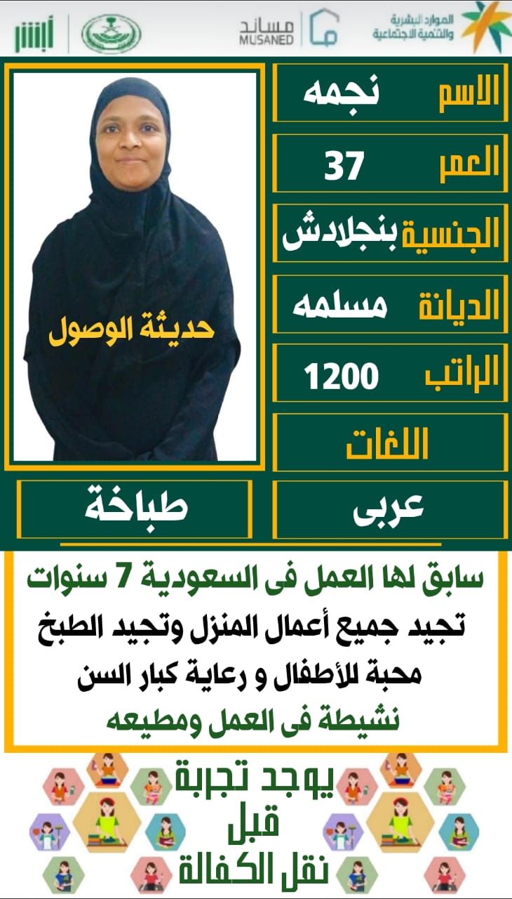 ارغب في عامله منزليه تجيد الطبخ واللغه العربيه والاهم مسلمه ايضاً نظيفه