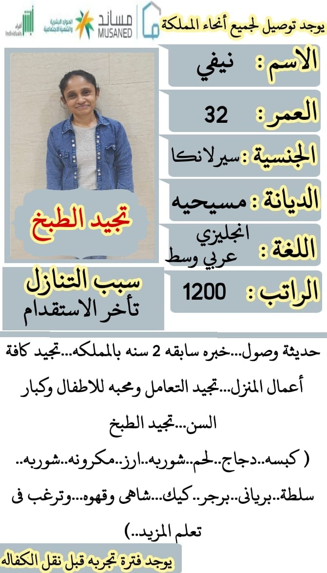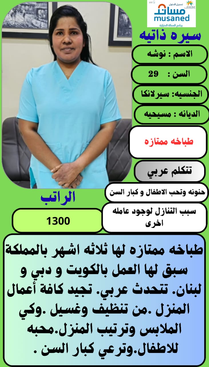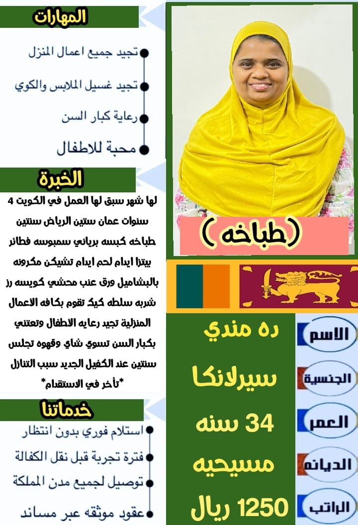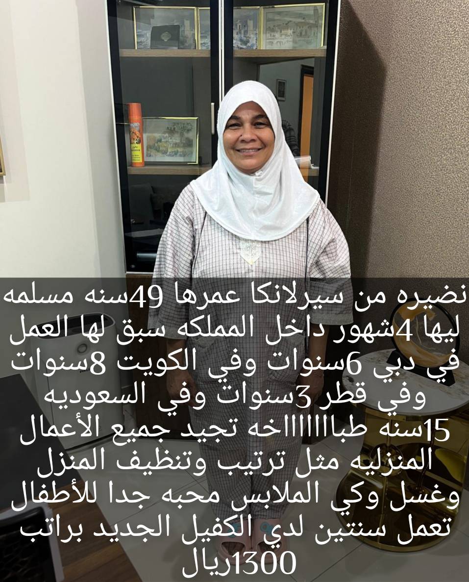 لدي عامله منزليه ممتازه للتنازل .. عامله سريلانكيه للتنازل لكفيل مباشر .. عمرها ٢٦ سنه مسيحيه .. بشوشه جدآ .. تحب الاطفال وتراعي كبار السن .. نشيطه وتجيد كافه اعمال المنزل كامله من تنظيف وترتيب وغسيل وكوي الملابس .. ماعندها مشكله في اي شيئ .. تشتغل سنتين واكتر لدي الكفيل الجديد.