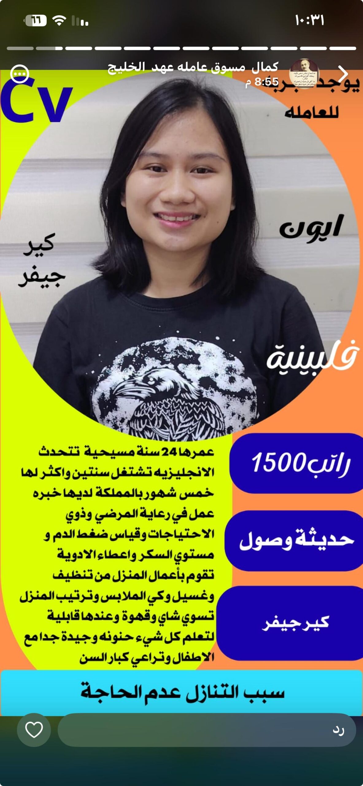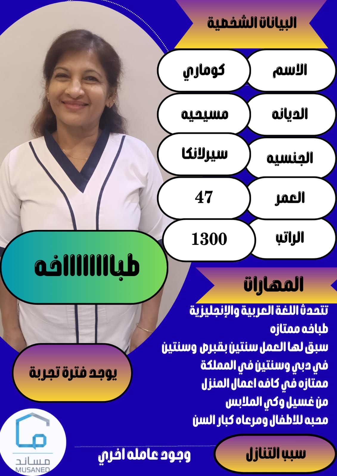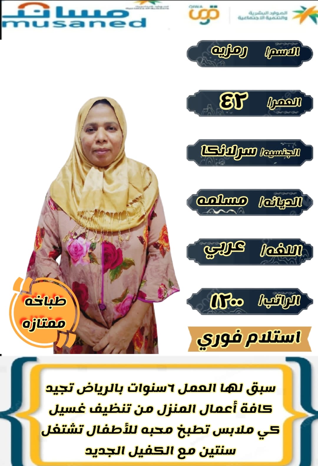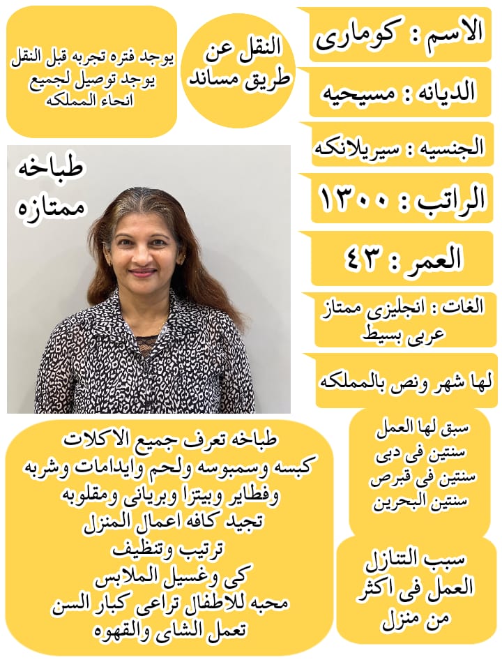 لدي عامله منزليه ممتازه للتنازل .. عامله سريلانكيه للتنازل لكفيل مباشر .. عمرها ٢٦ سنه مسيحيه .. بشوشه جدآ .. تحب الاطفال وتراعي كبار السن .. نشيطه وتجيد كافه اعمال المنزل كامله من تنظيف وترتيب وغسيل وكوي الملابس .. ماعندها مشكله في اي شيئ .. تشتغل سنتين واكتر لدي الكفيل الجديد.