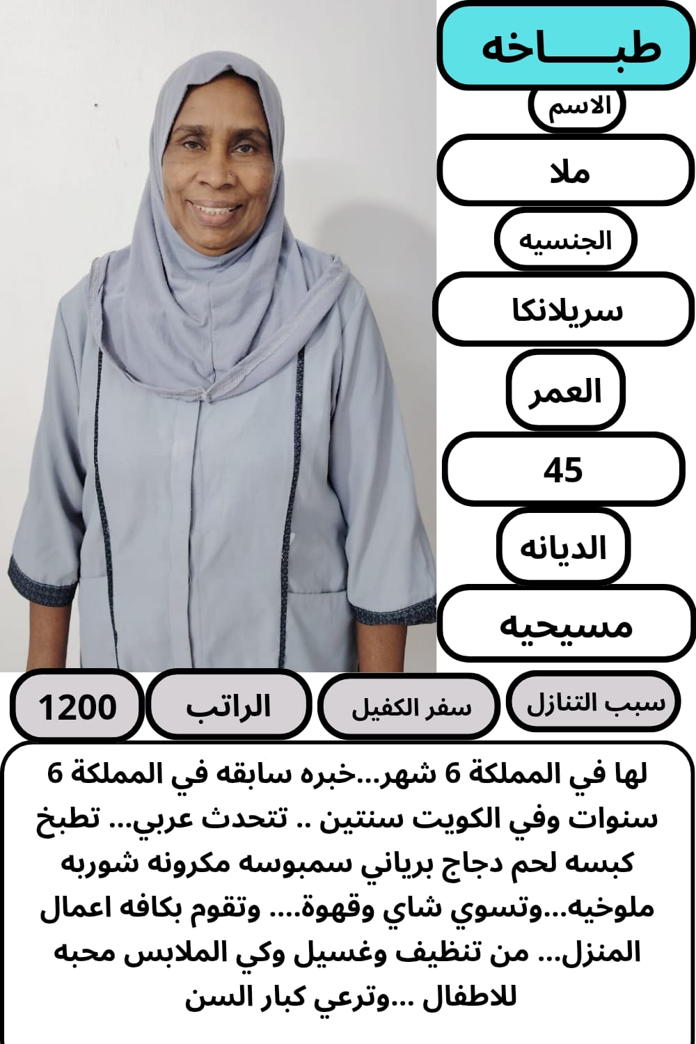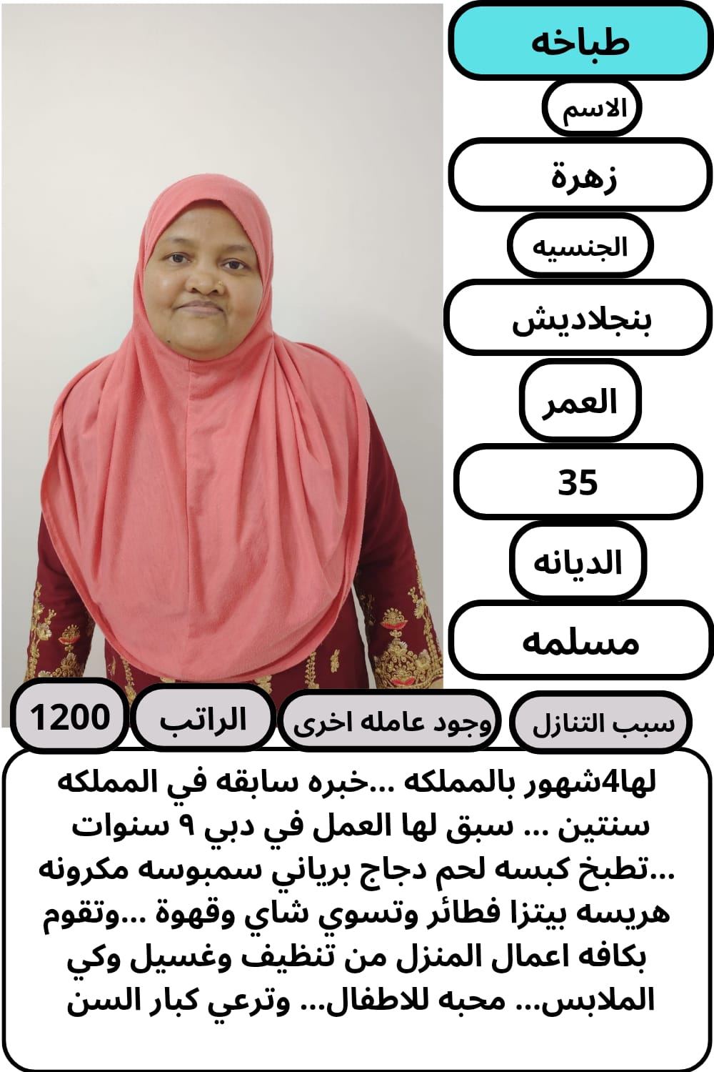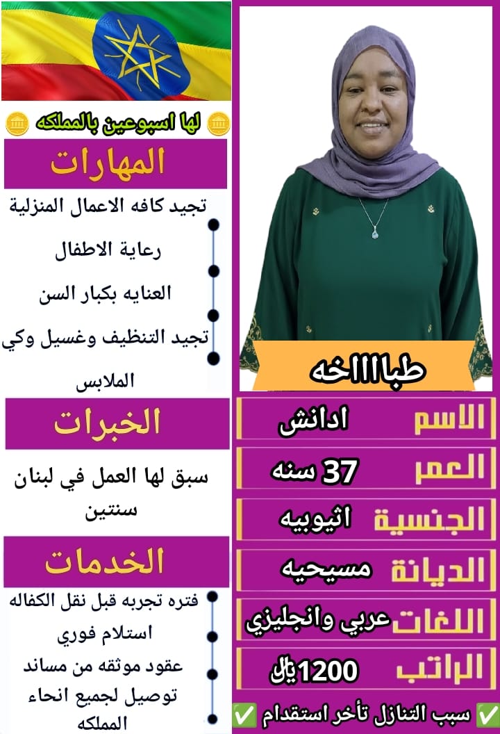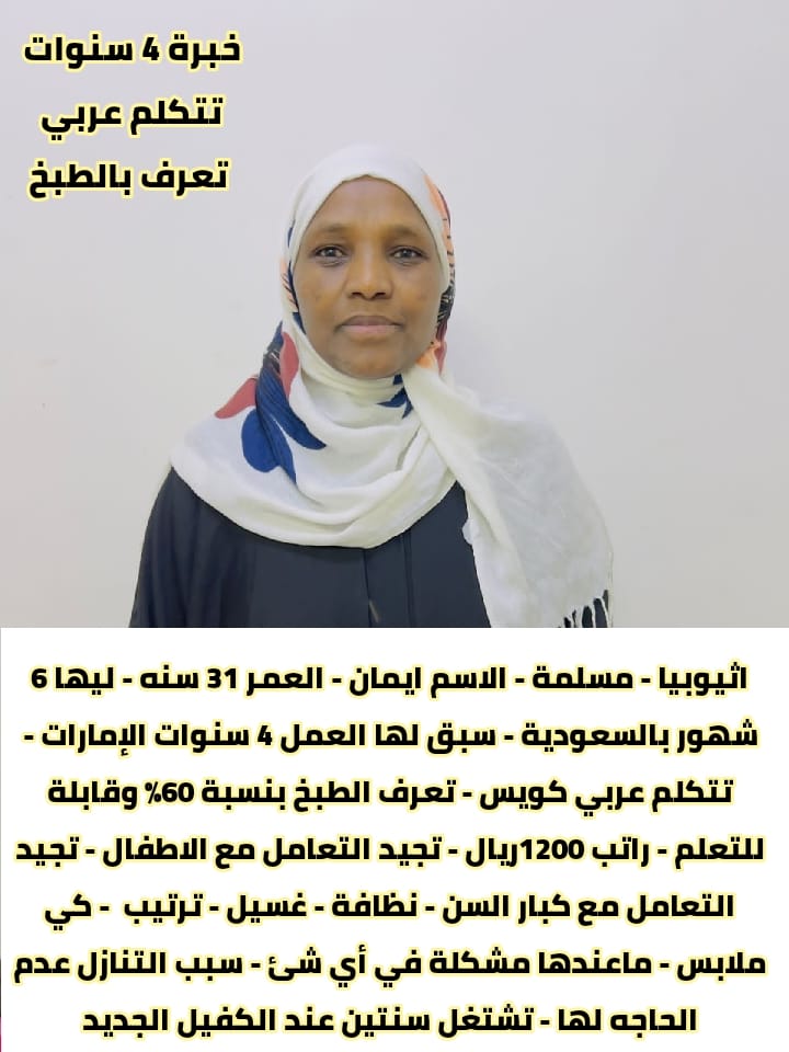 طباخة اثيوبية مسلمه عمرها ٣١ سنة سبق لها العمل بالسعوديه خمس سنوات تكلم عربي وتجيد كافة أعمال المنزل راتب ١٢٠٠