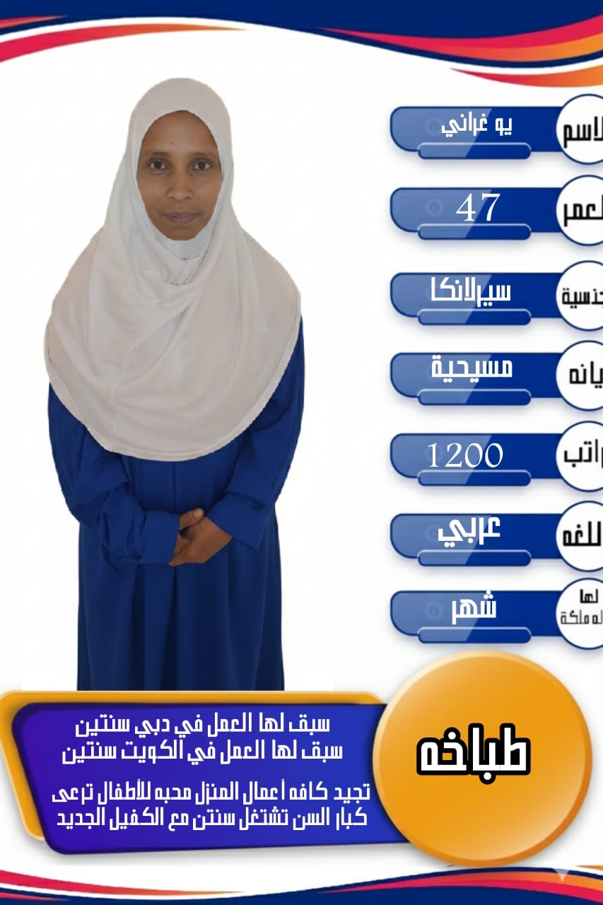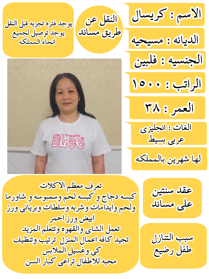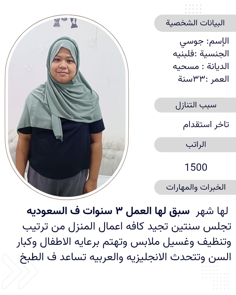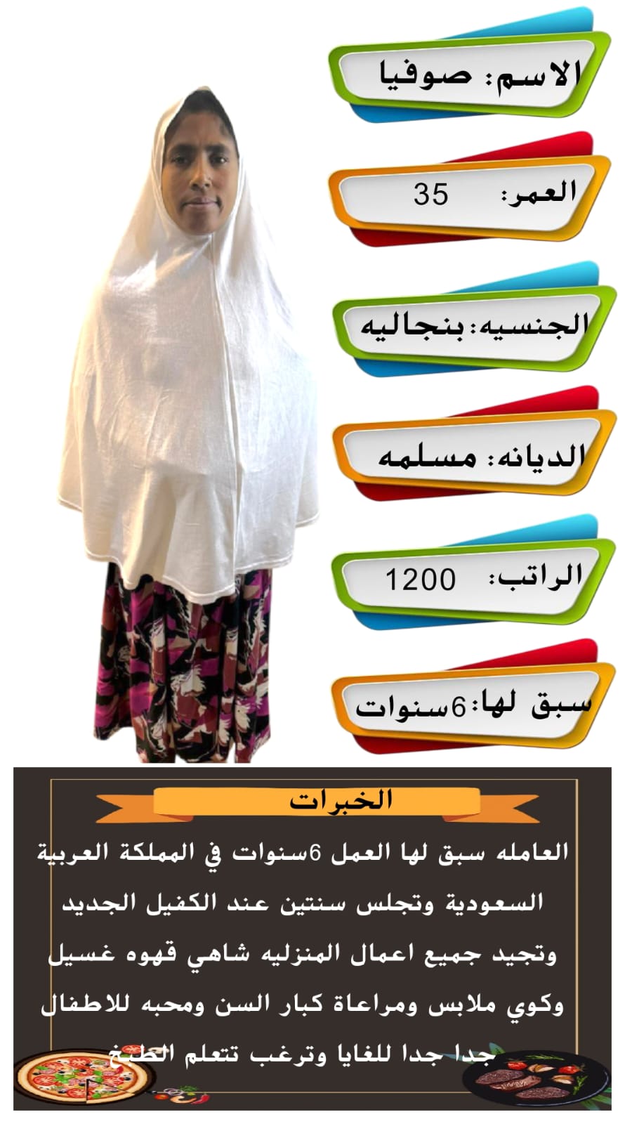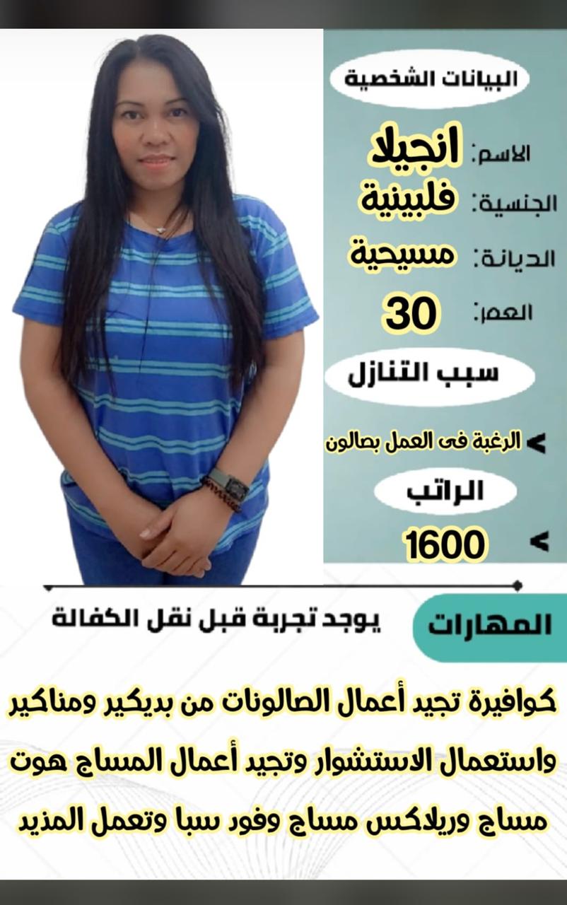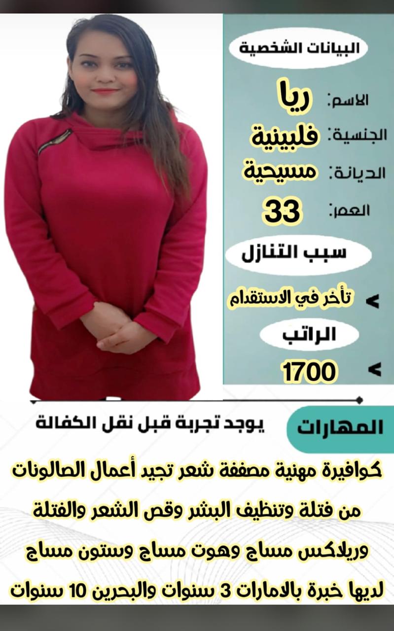 لدينا عاملات للتنازل من الفلبين وإندونيسيا وبنجلاديش واوغندا وكينيا وإثيوبيا طباخات ومربيات وممرضات وكوافيرات ماهرات