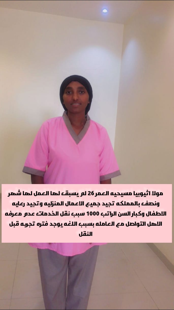 اثيوبيه مسيحيه عمرها ٢٣ ..راغبه للعمل تتكلم عربي بسيط تعرف تسوي شاهي وقهوه وفطور وكبسه ومرق وتنظيف وكوي وسريعه بالشغل والتعلم