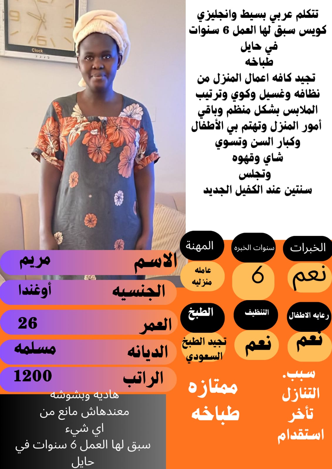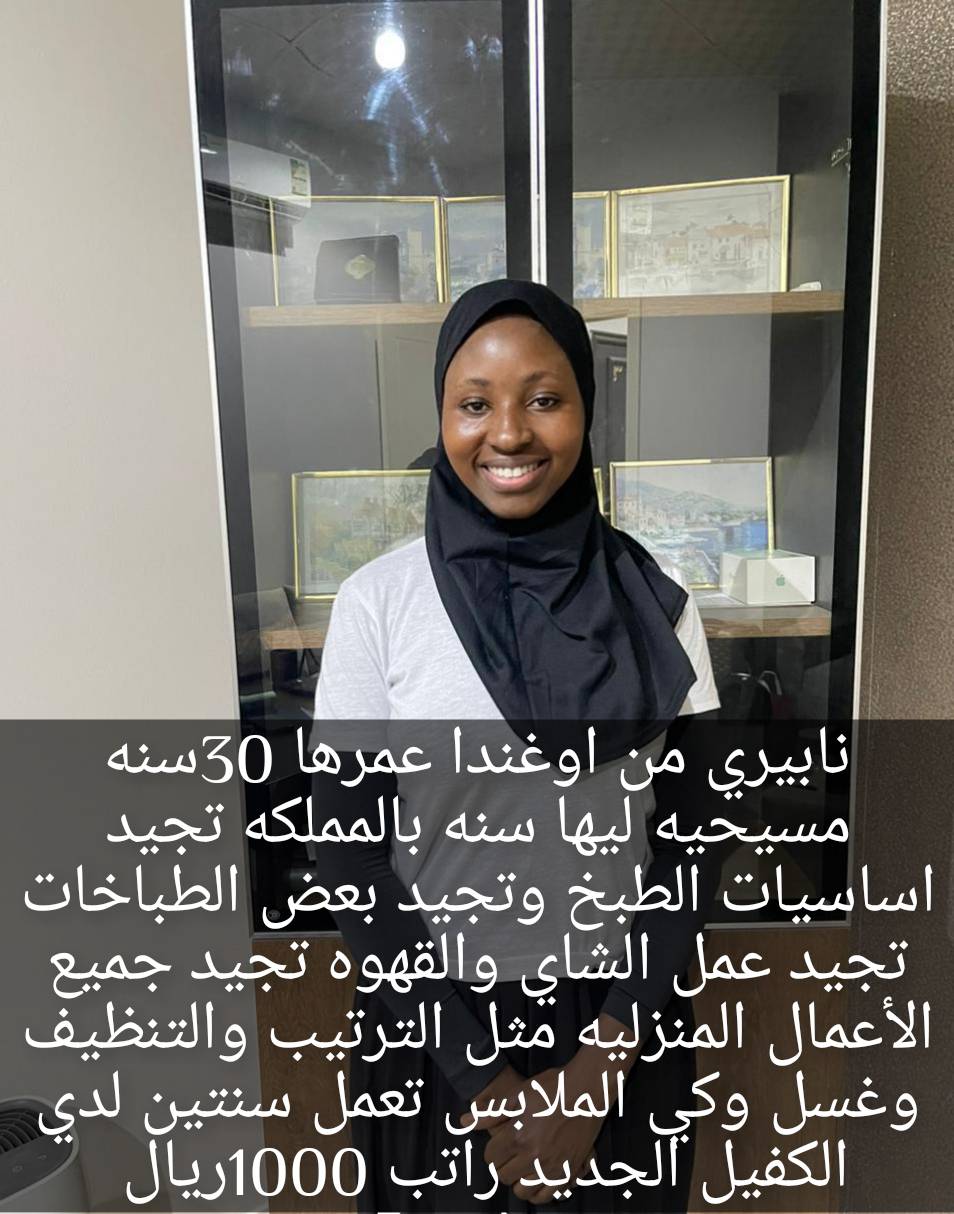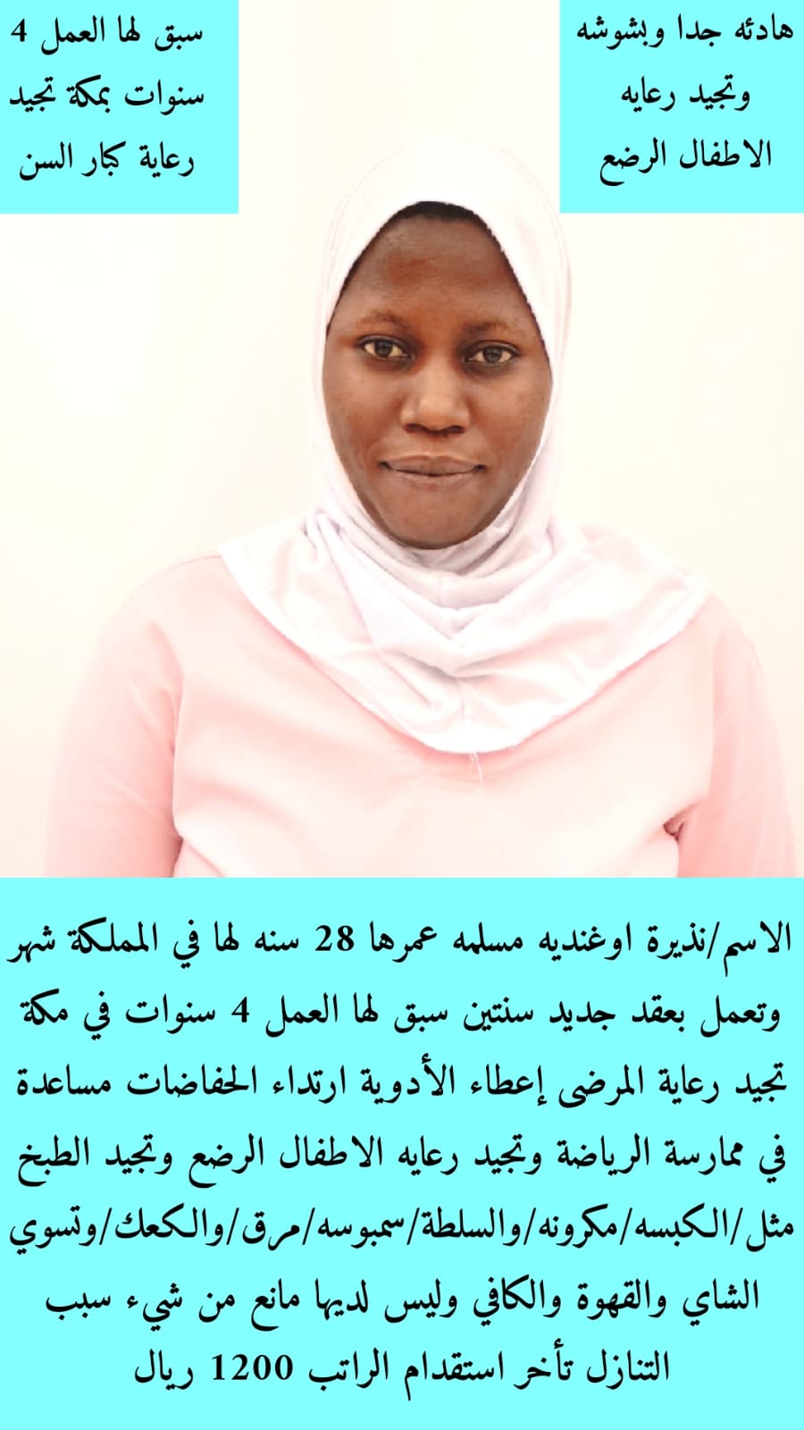 اوغندية ممتازة تجيد بعض الطبخ السعودي الراتب 1000