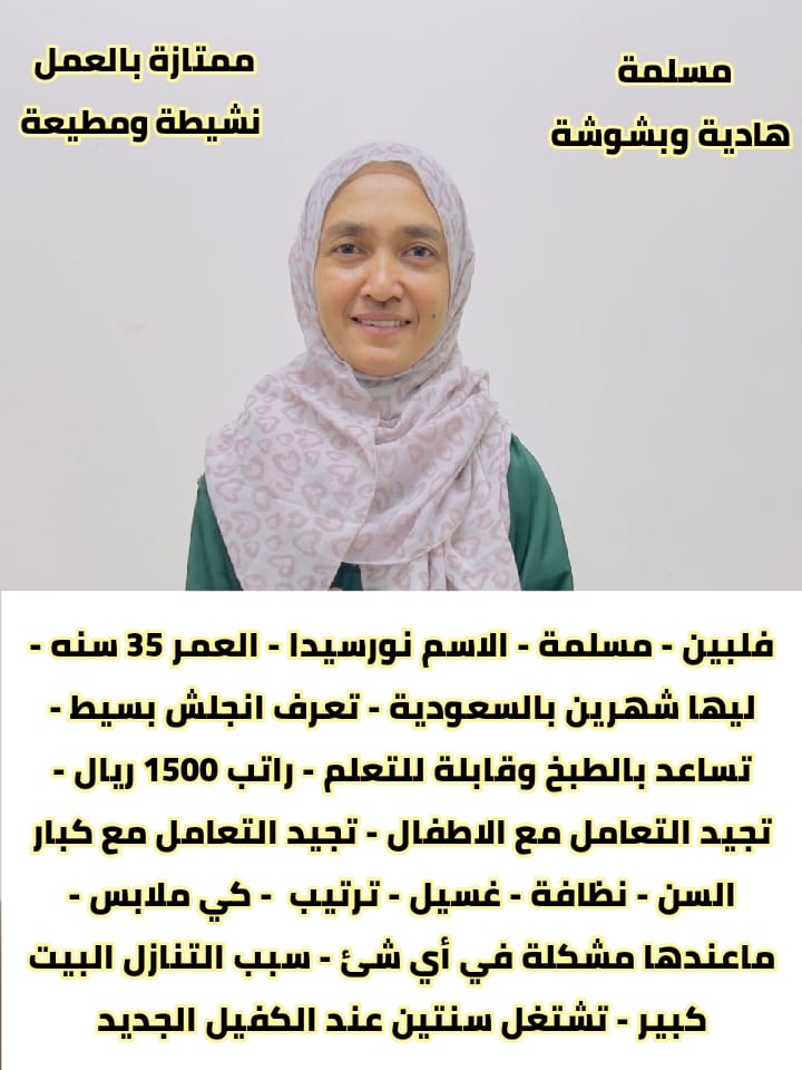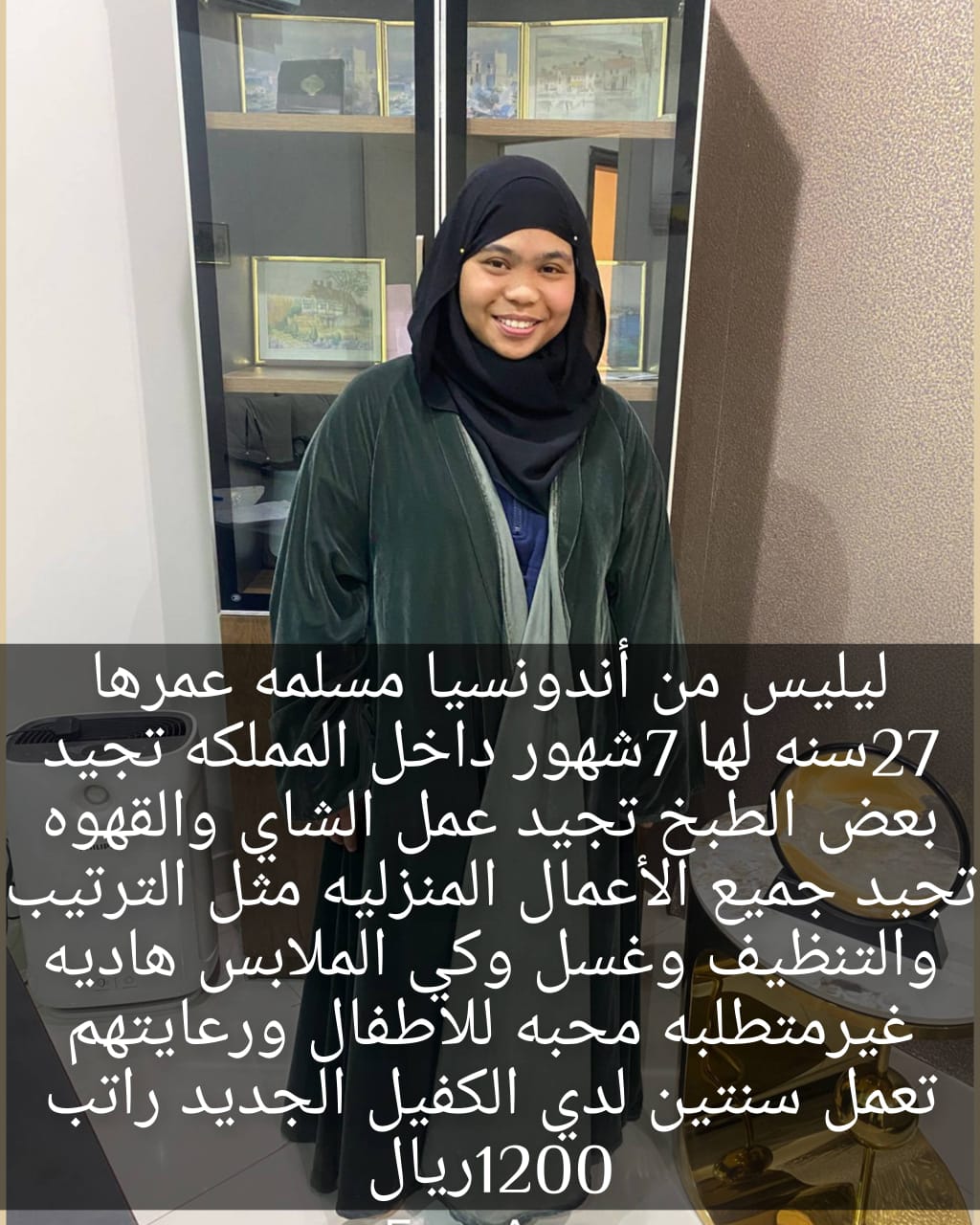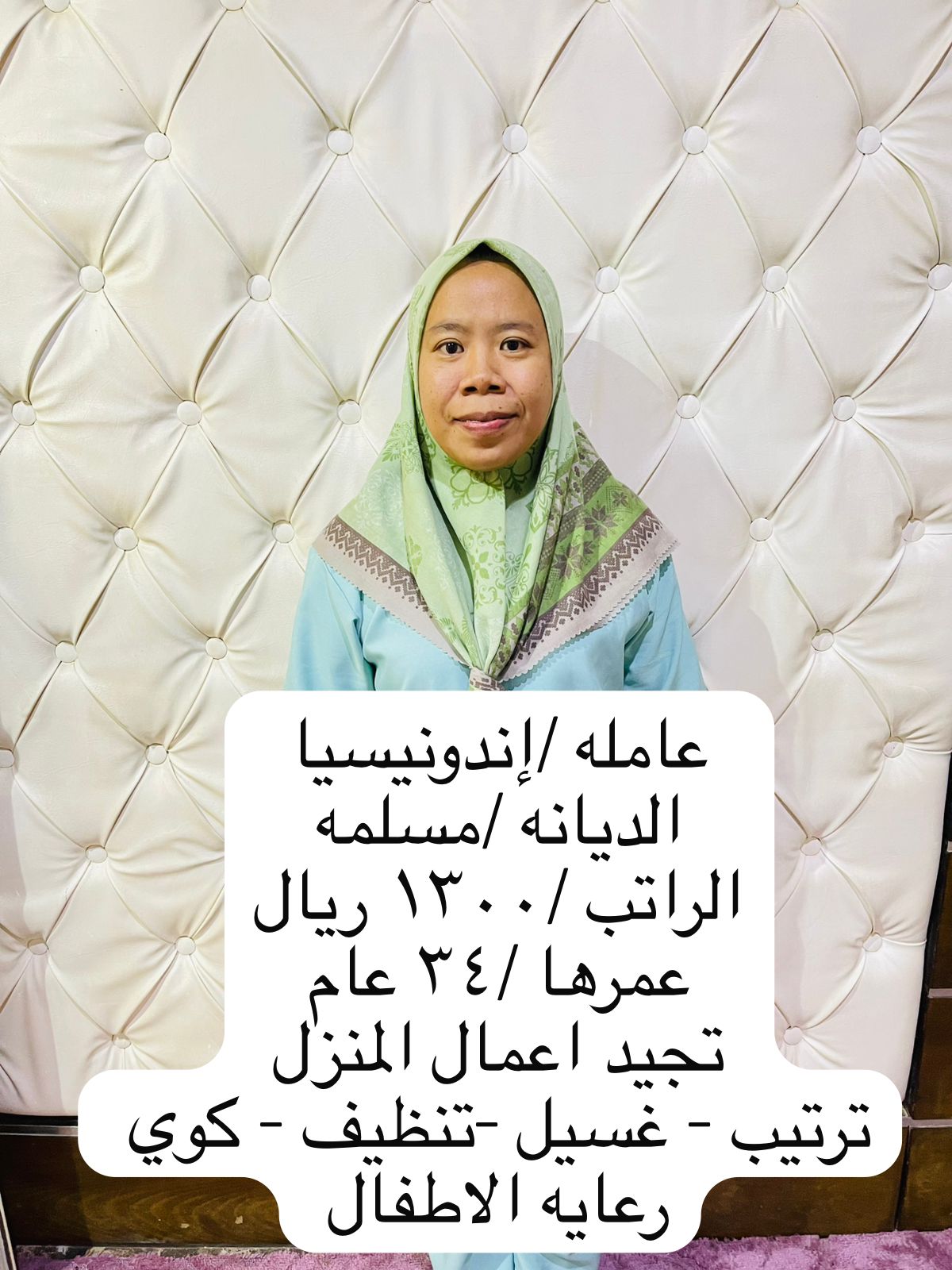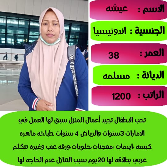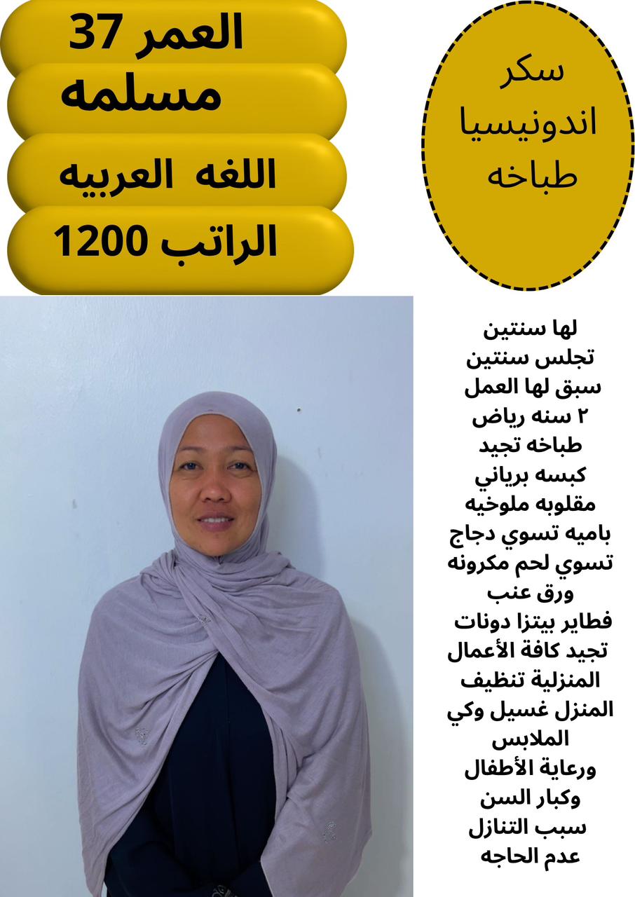 اندنسيا العمر 38 سبق لها العمل في ابو ظبي 3 و الدمام 5 سنوات تجيد بعض الطبخ
