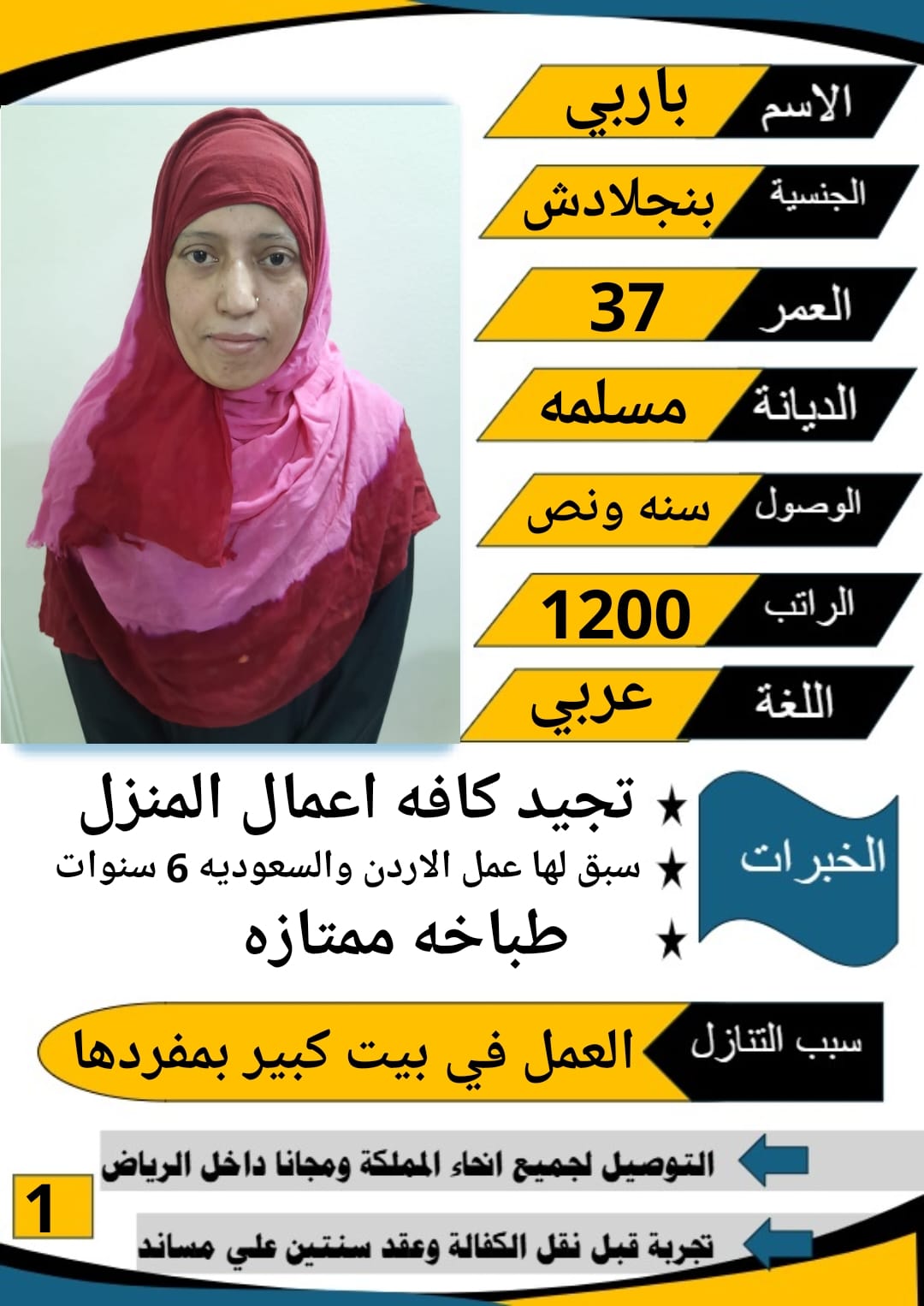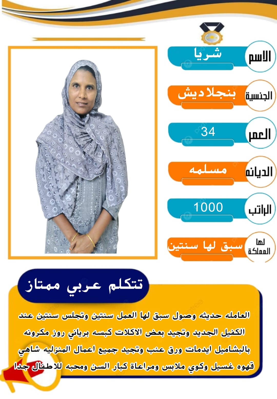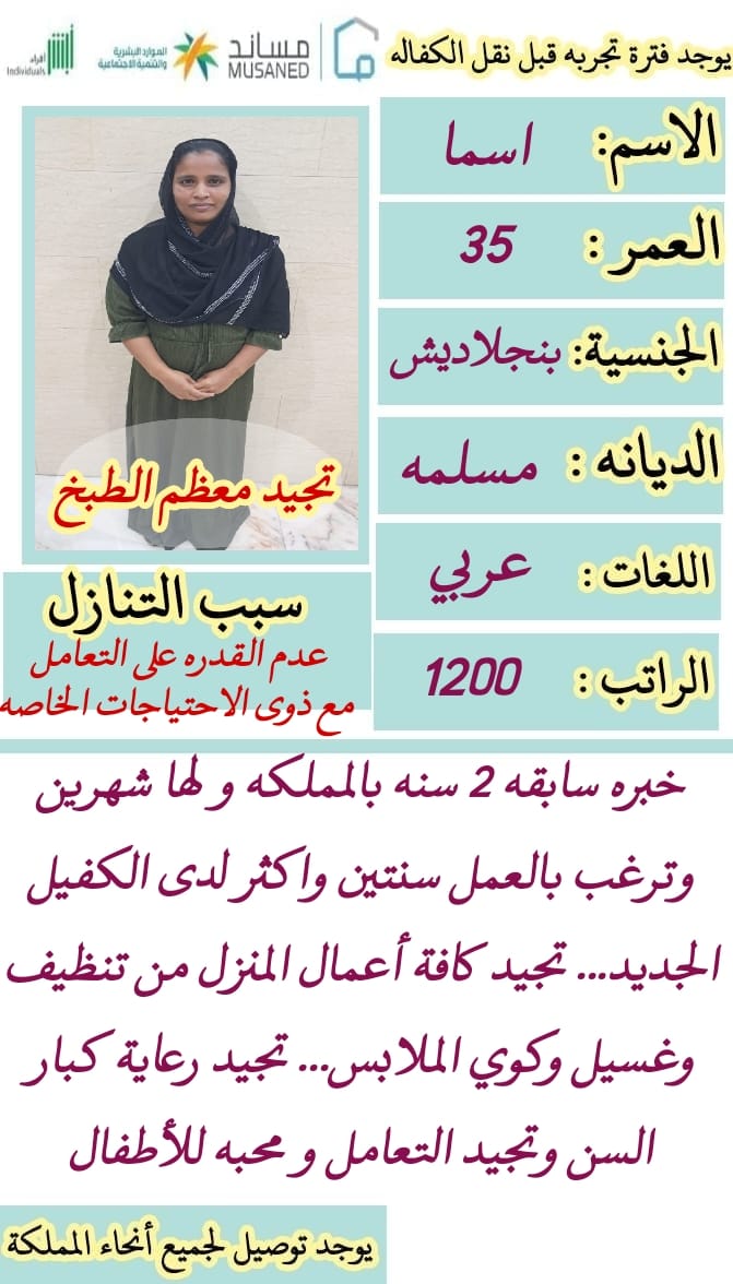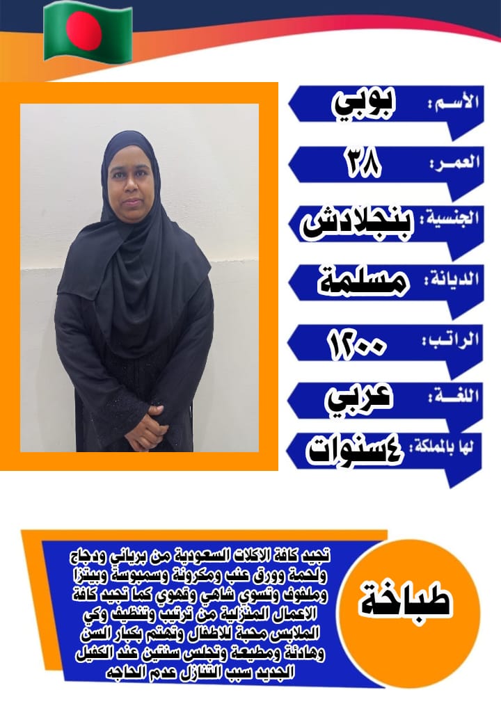 اندنسيا العمر 38 سبق لها العمل في ابو ظبي 3 و الدمام 5 سنوات تجيد بعض الطبخ