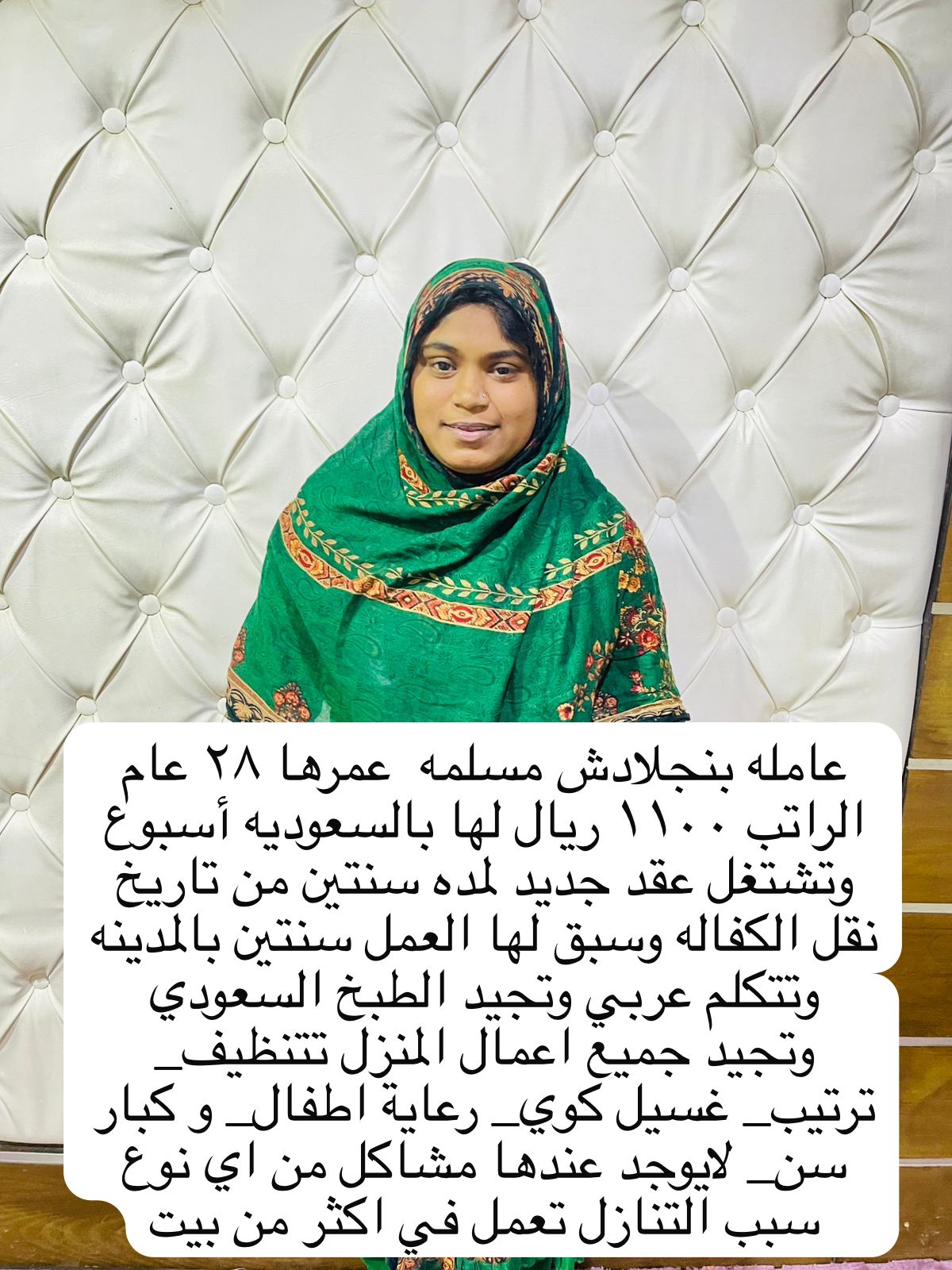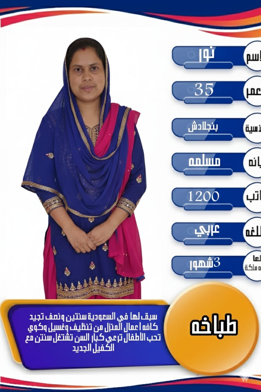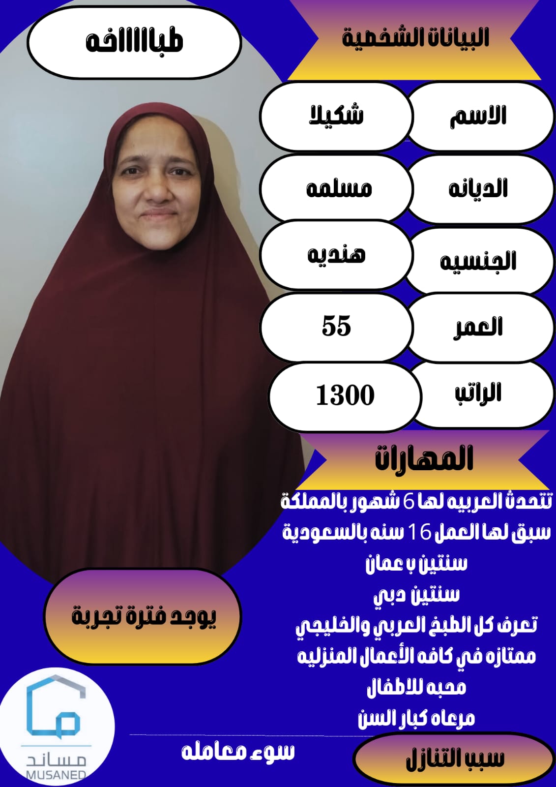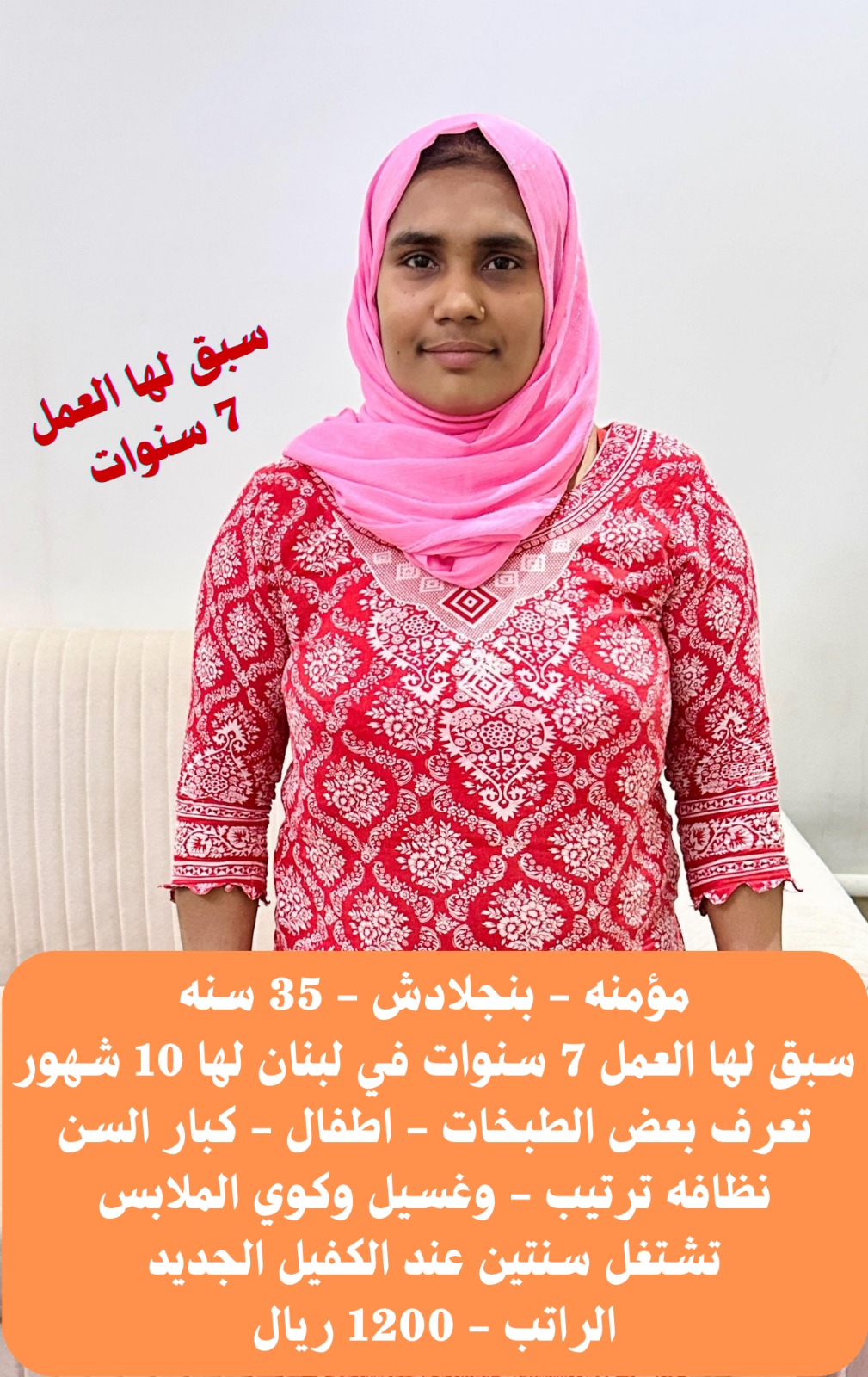 اندنسيا العمر 38 سبق لها العمل في ابو ظبي 3 و الدمام 5 سنوات تجيد بعض الطبخ