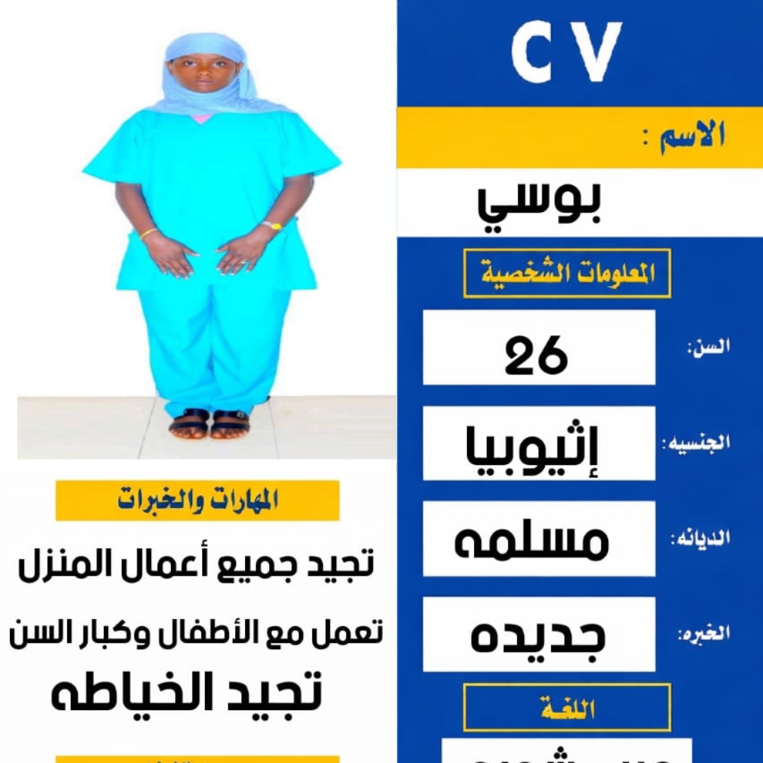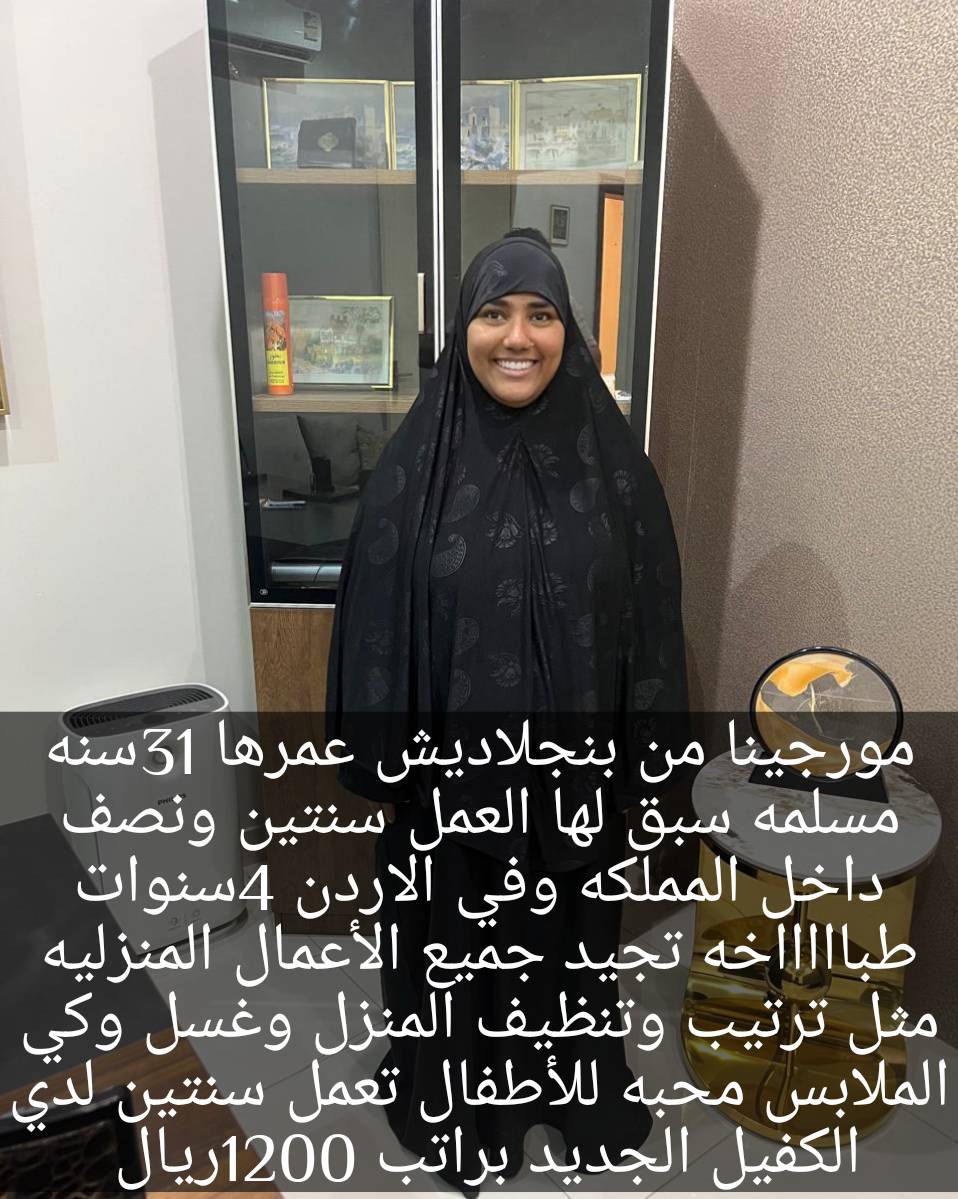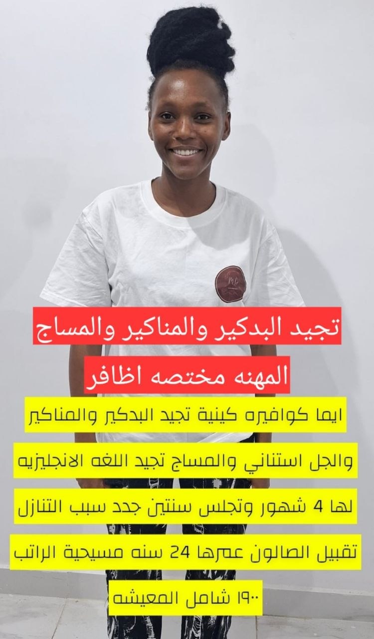 كينية مسلمة 24 سنة تجيد بعض الطبخ وكل اعمال المنزل كاملة الراتب 1000