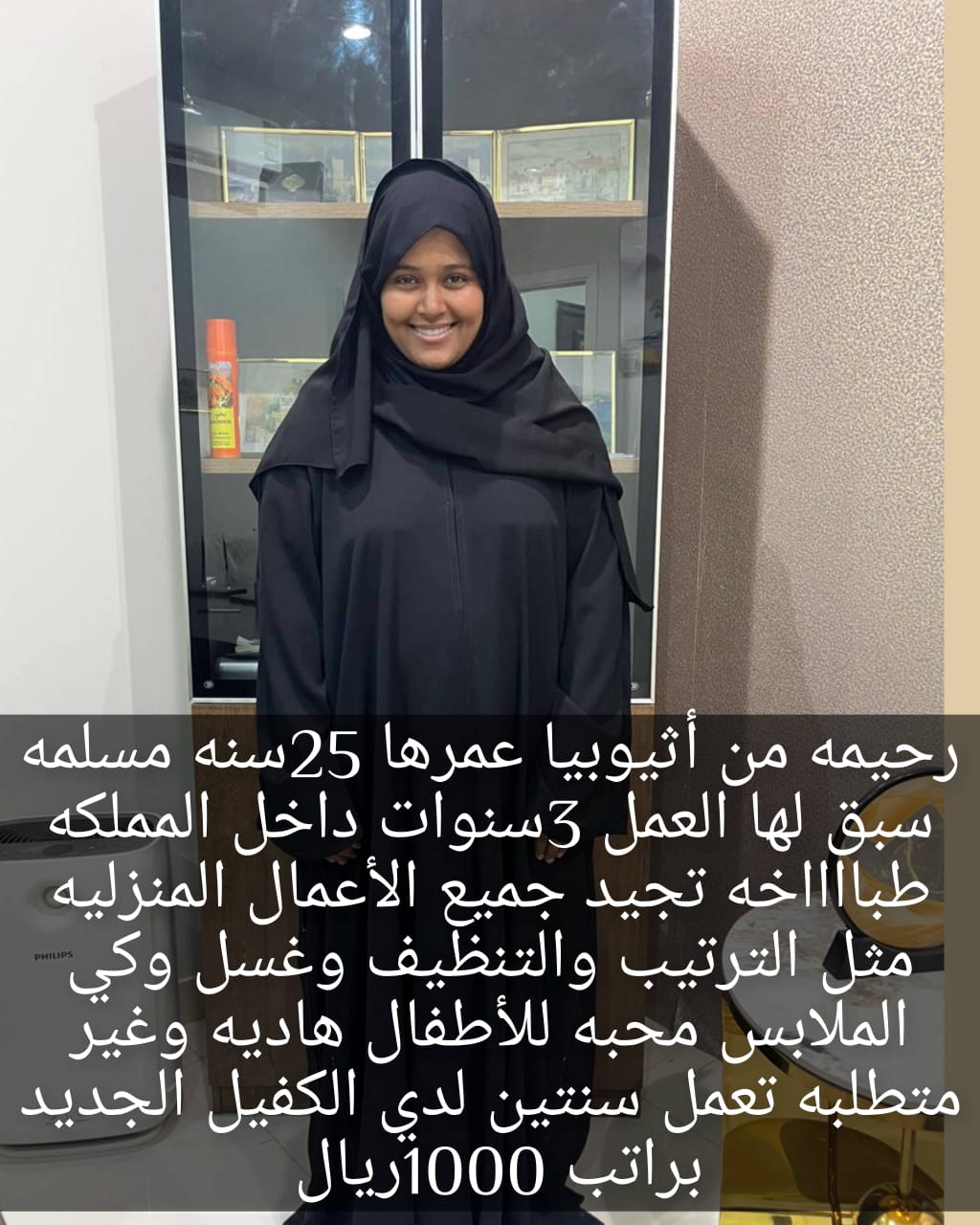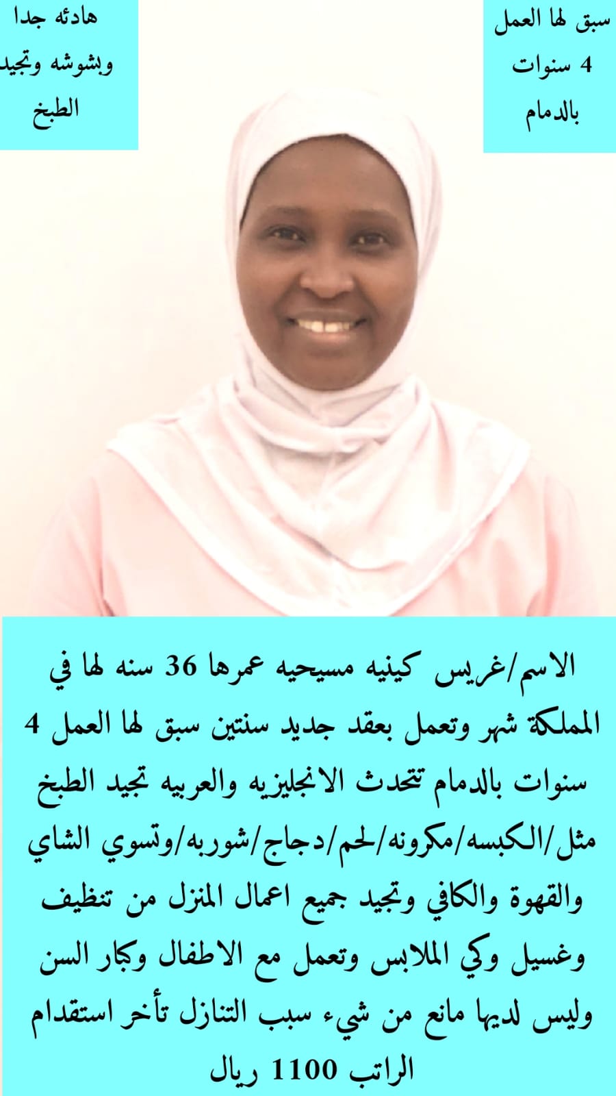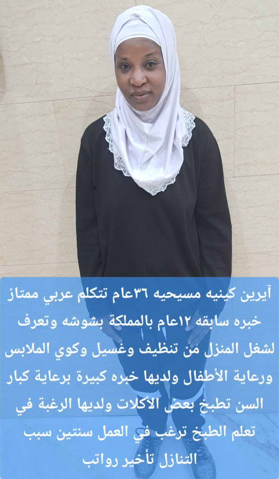 كينية مسلمة 24 سنة تجيد بعض الطبخ وكل اعمال المنزل كاملة الراتب 1000