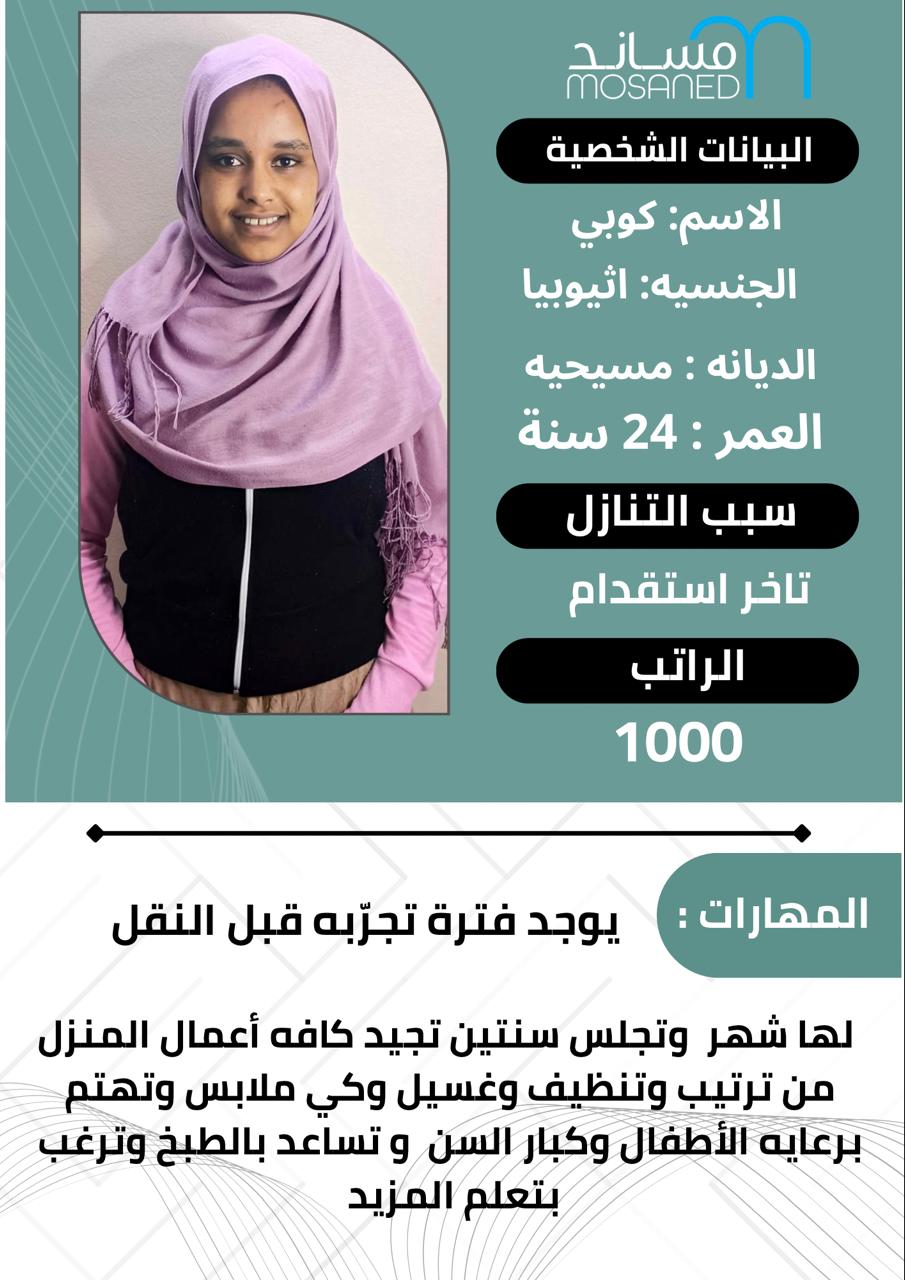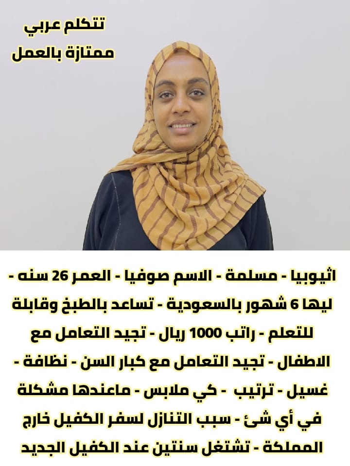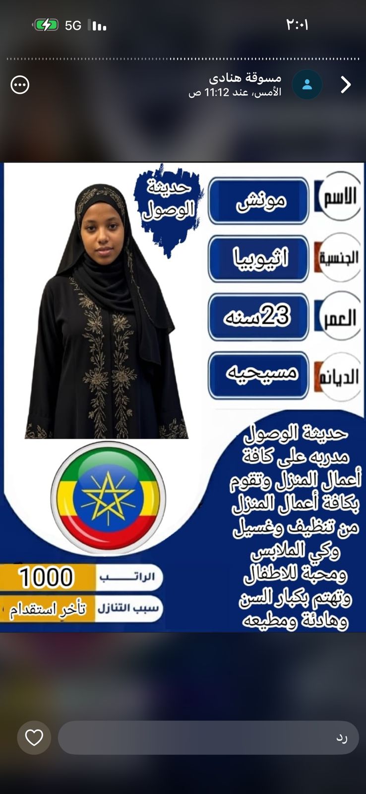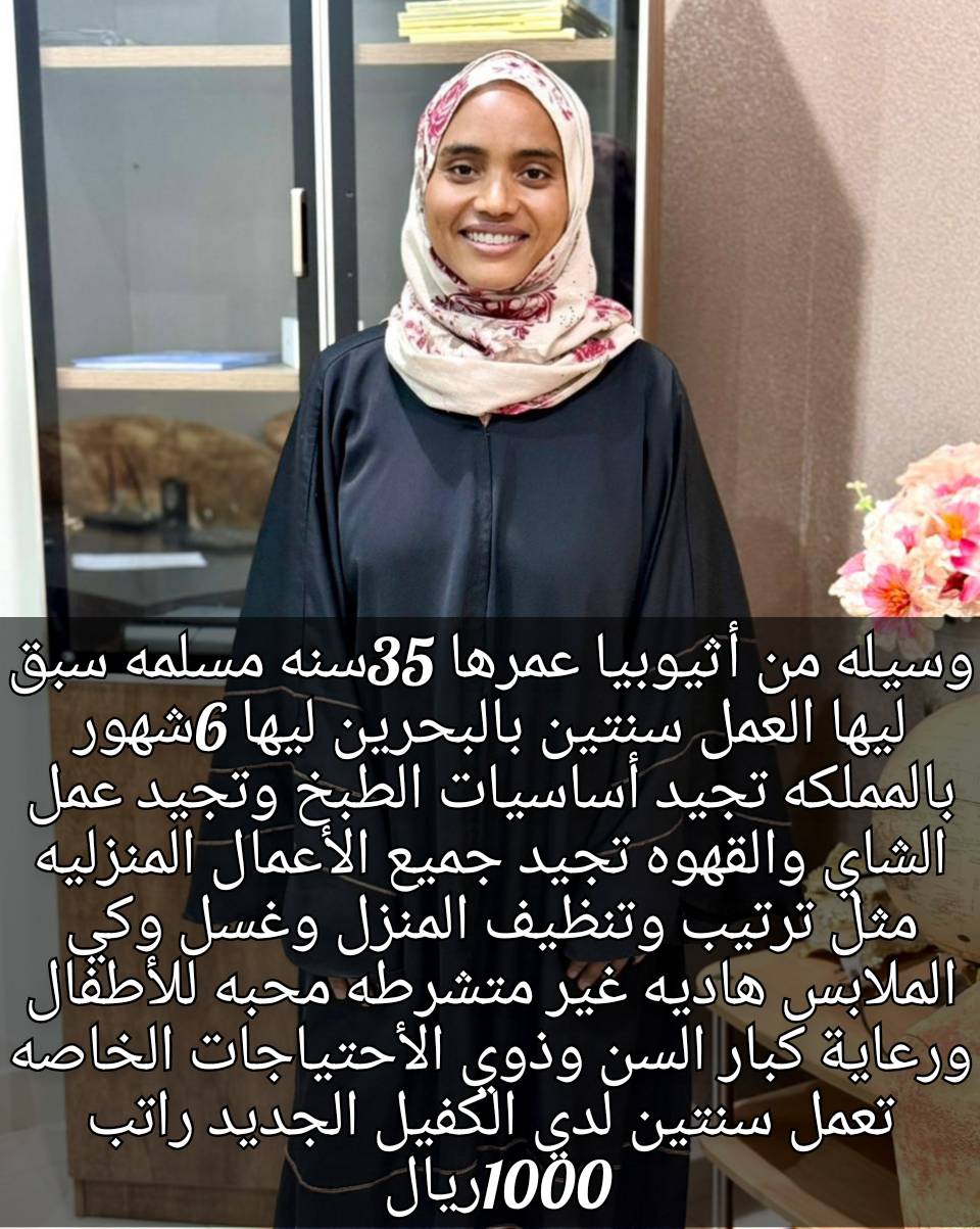 عاملة منزلية تجيد العمل بشكل جيد جدًا اثيوبية راتب ١٠٠٠ سبب التنازل : لا ترغب بوجود اطفال