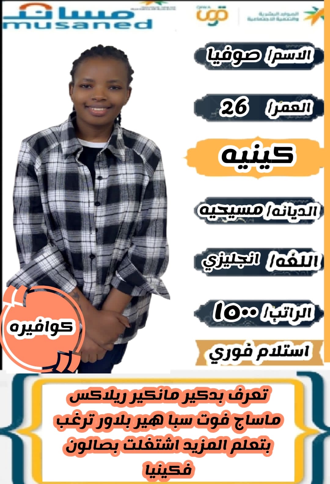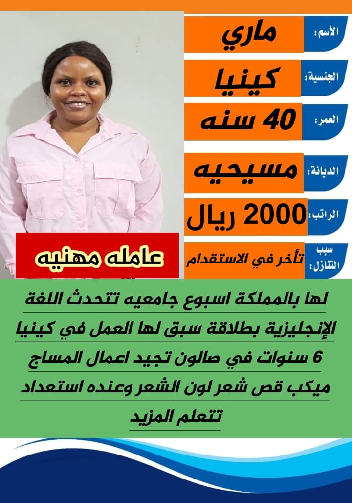 كينية ممتازة بالشغل ونشيطة سبق لها العمل سنتين الراتب 1000