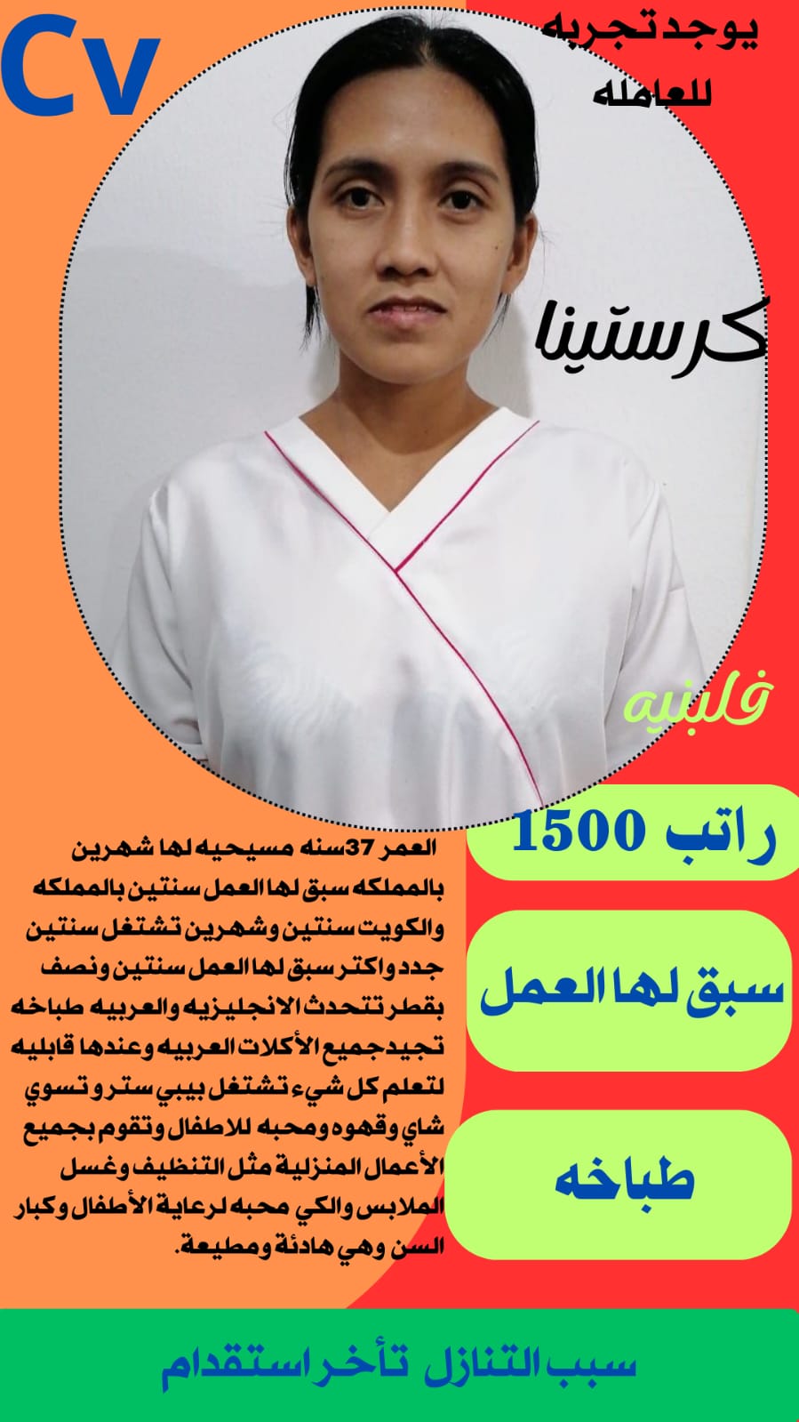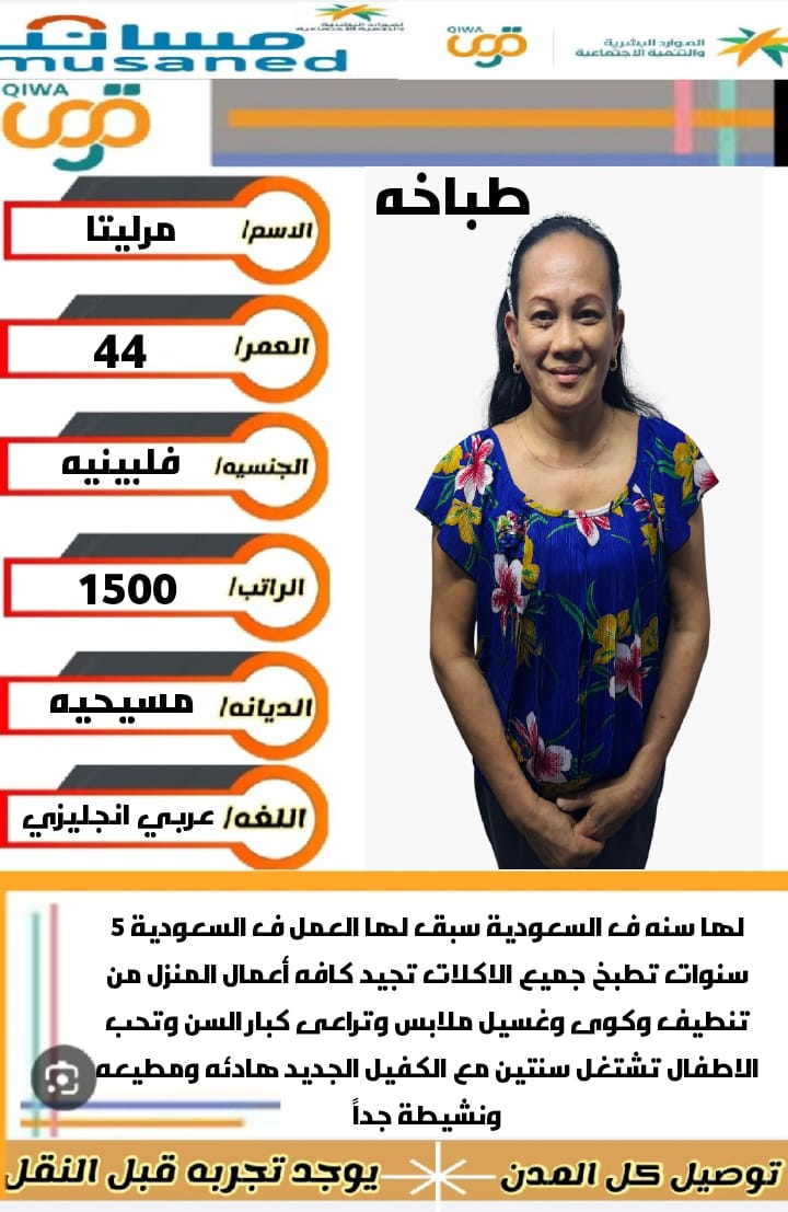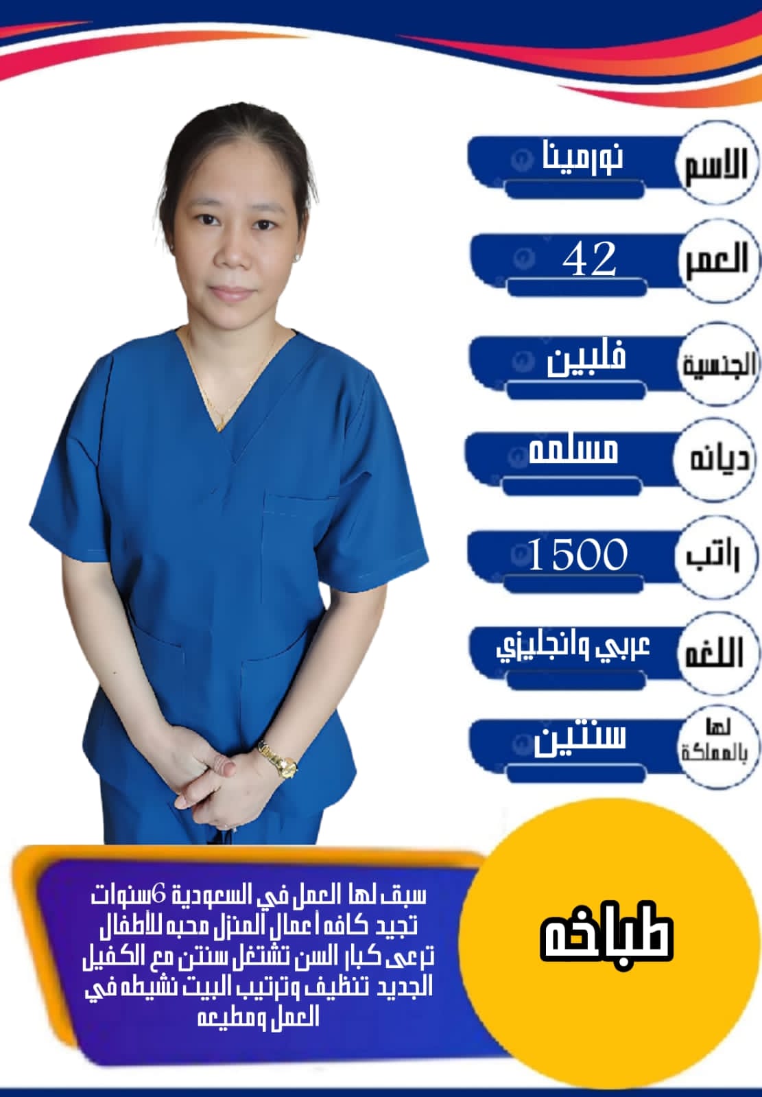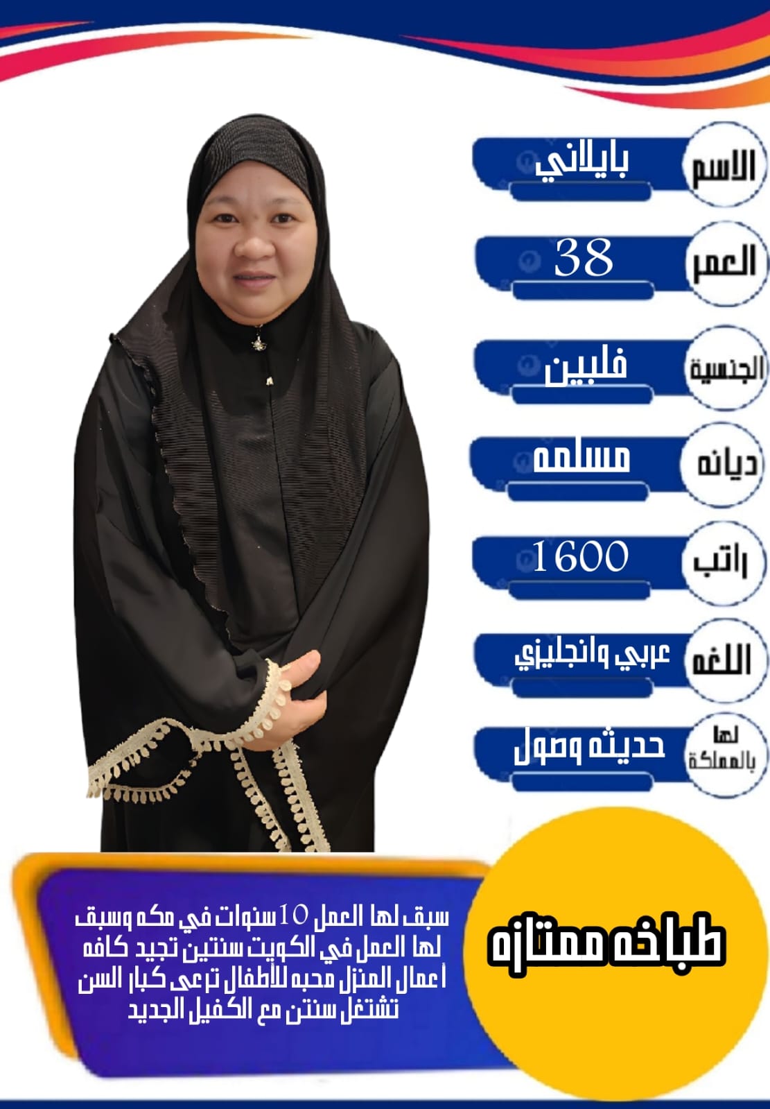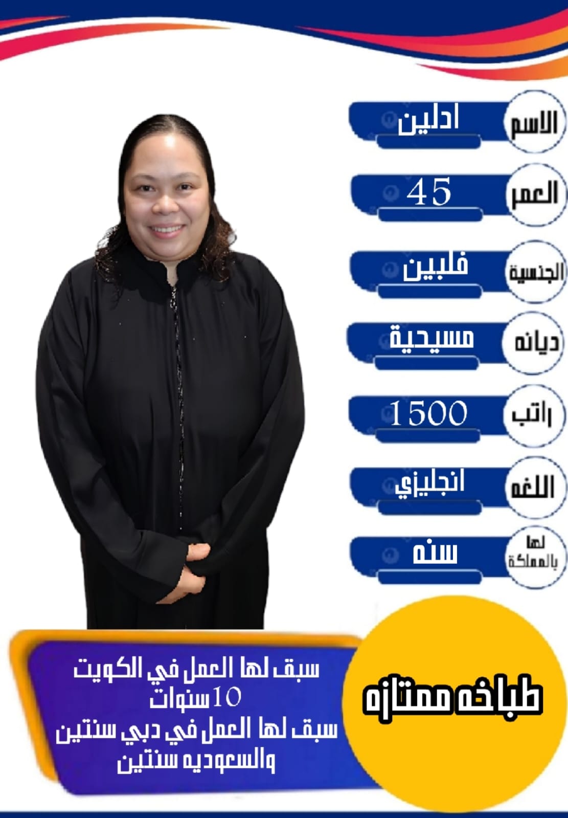 فلبينيه عمرها 40 راتبها 1500تجيد الطبخ السعودي وجميع الاعمال المنزليه محبه للاطفال وسبق لها العمل 6سنوات في السعوديه