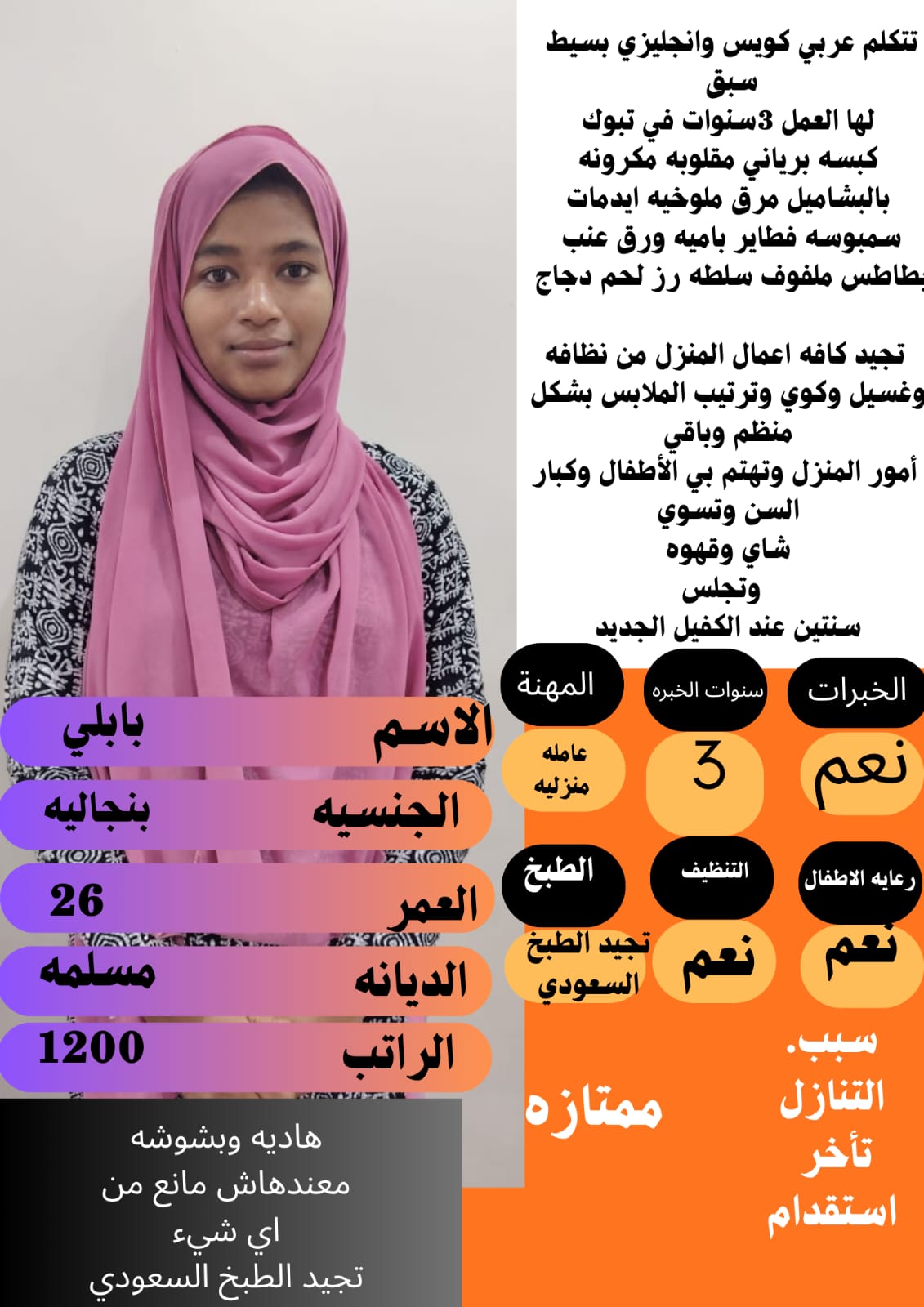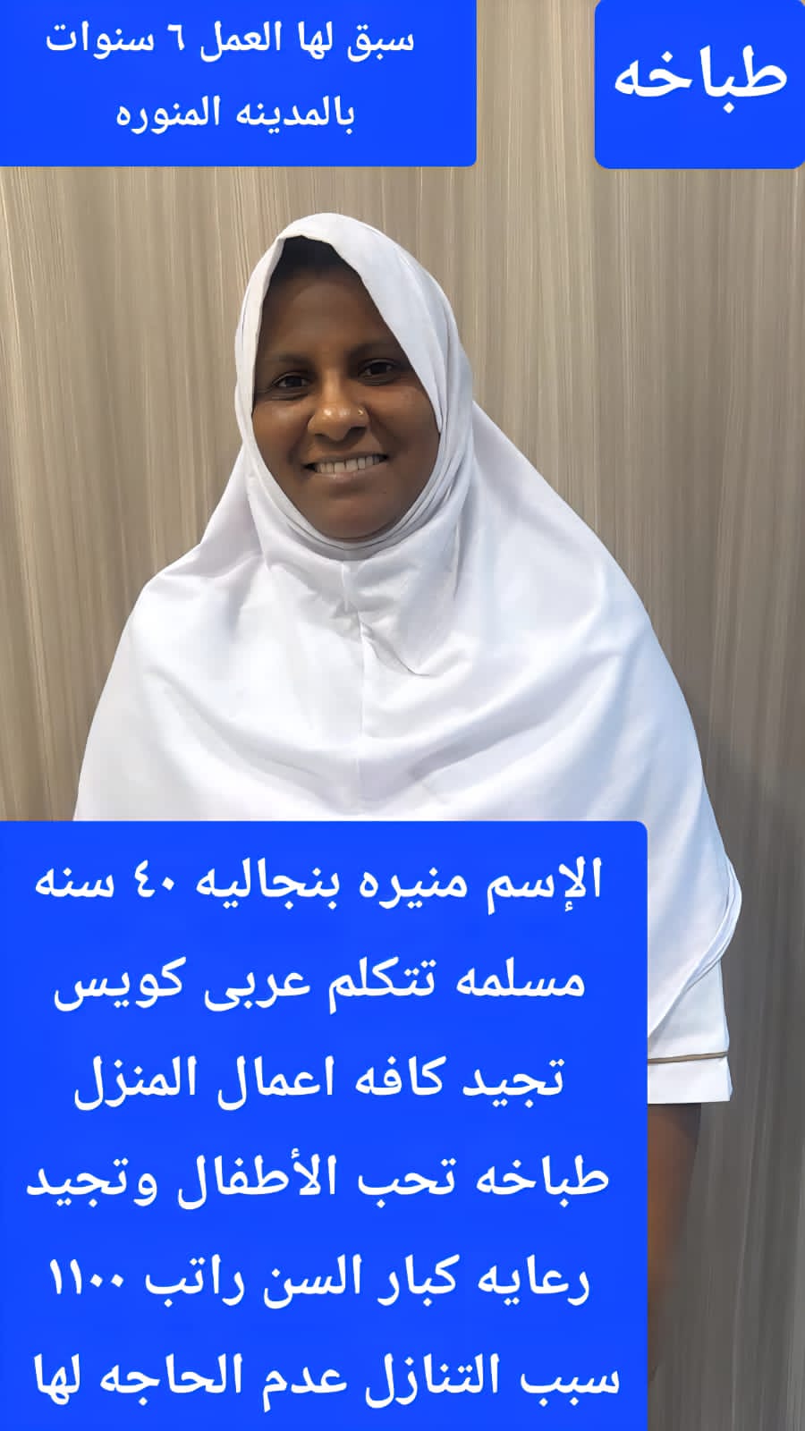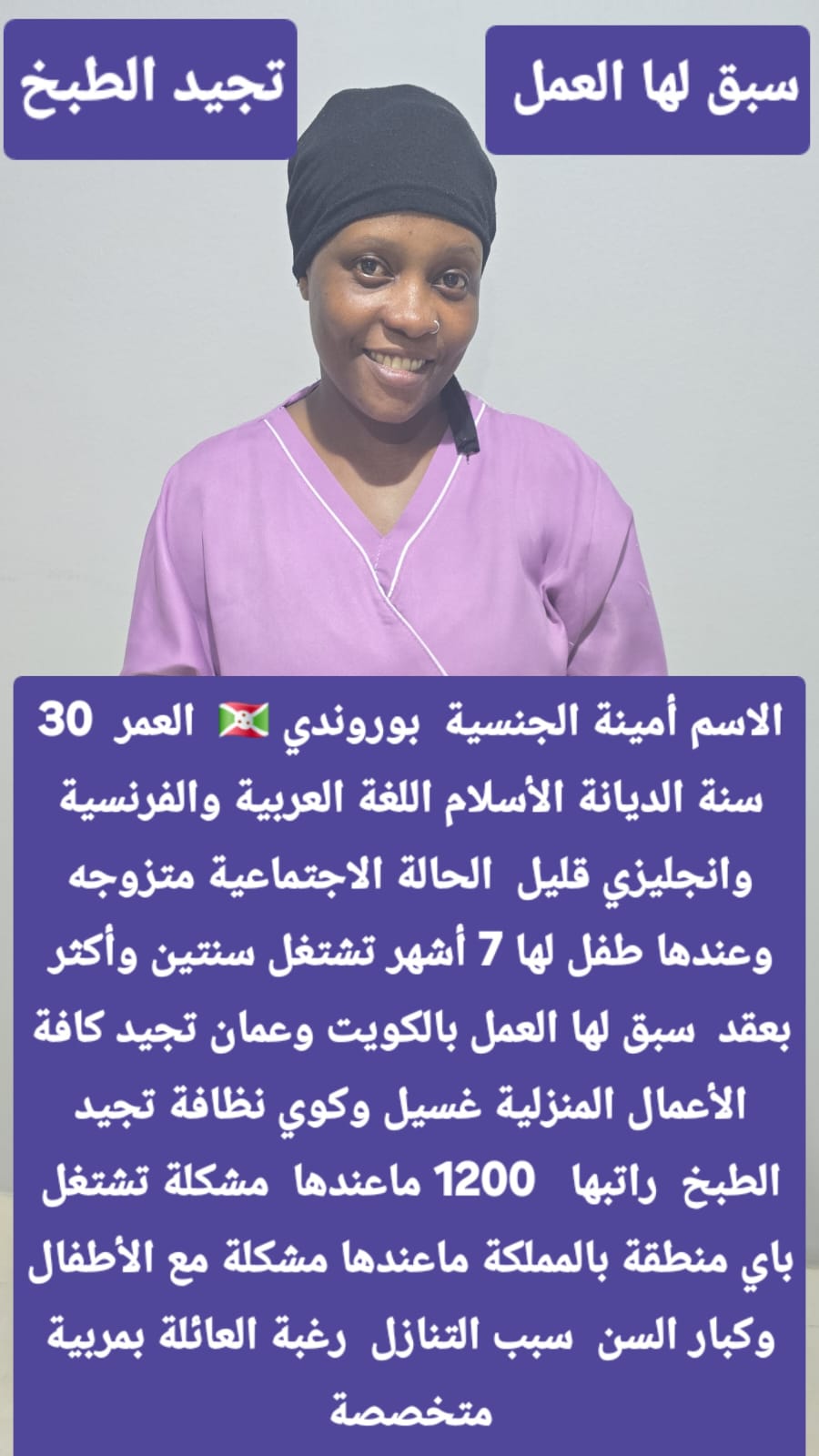 عاملة برونديه مسلمه تعرف الطبخ ورعابه الاطفال وكبار السن تنازل 12000شامل