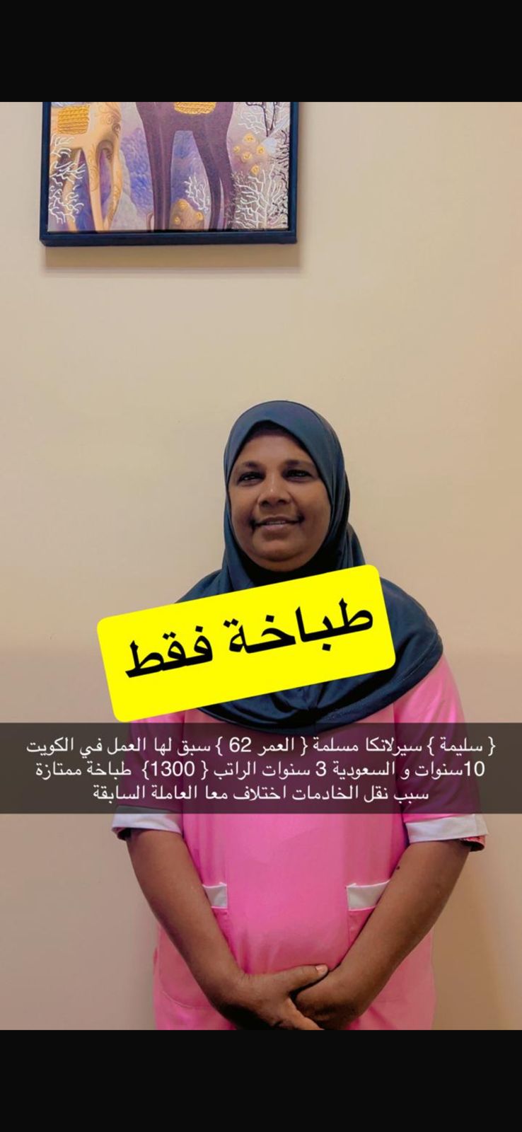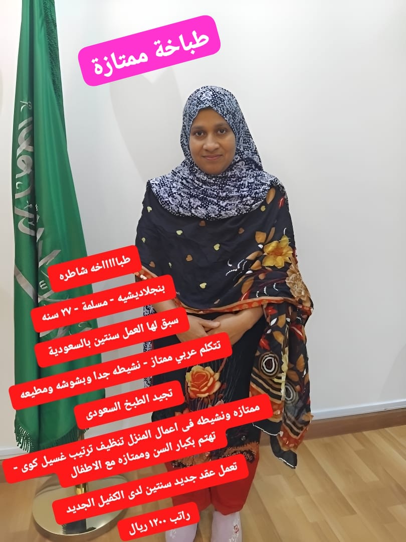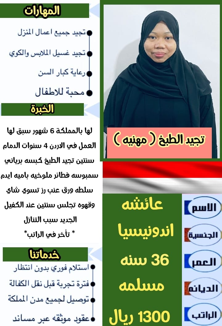 اندونيسيه مسلمه 38سنه تتحدث عربي طباخه ممتازه جدا لجميع الاكلات سبق لها العمل سنتين بالمملكه تراعي كبار السن والاطفال ايضا الراتب 1300
