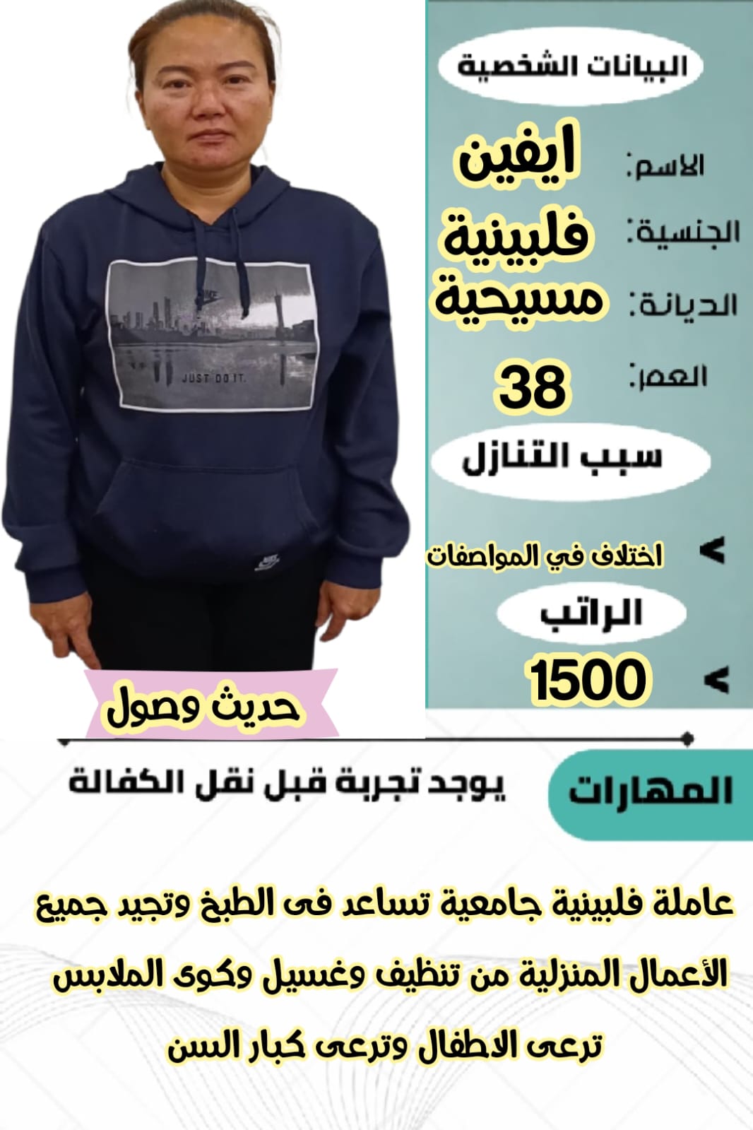 فلبينة حديثة وصول للتنازل ، ممتازه لرعاية الاطفال وكبار السن ، تجيد حميع اعمال المنزل غسيل وكوي الملابس تنظيف وترتيب المنزل