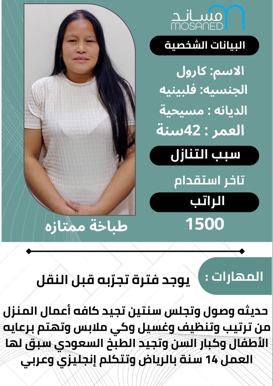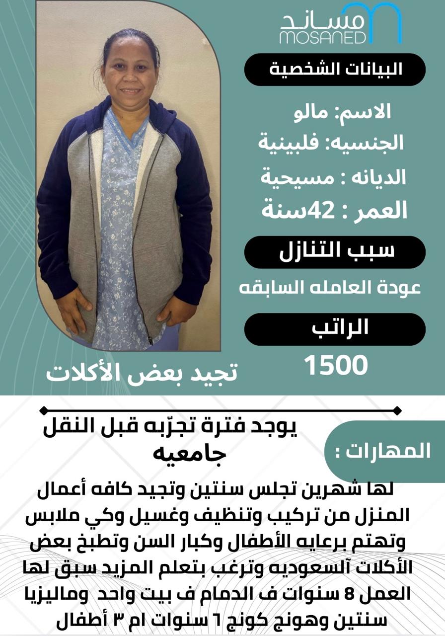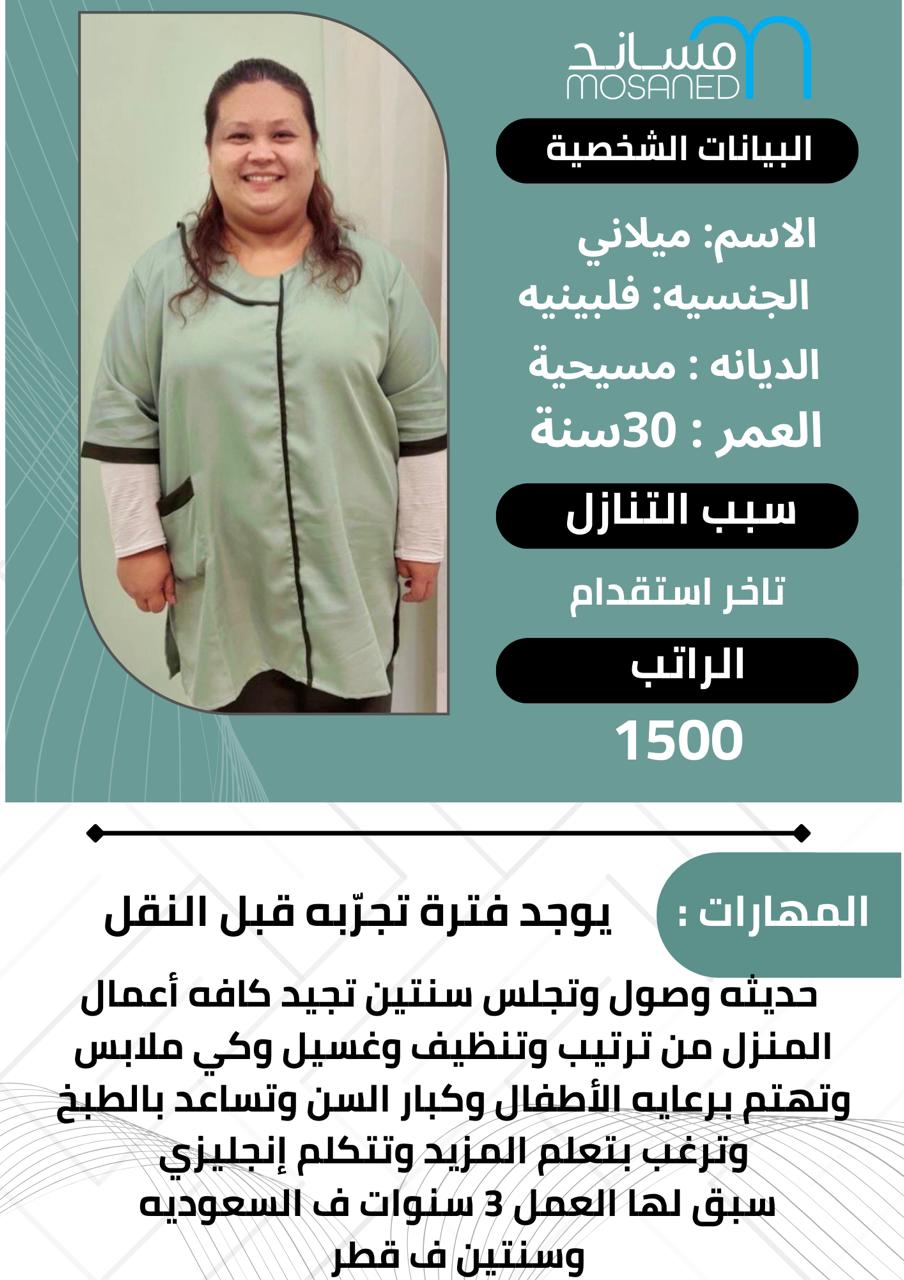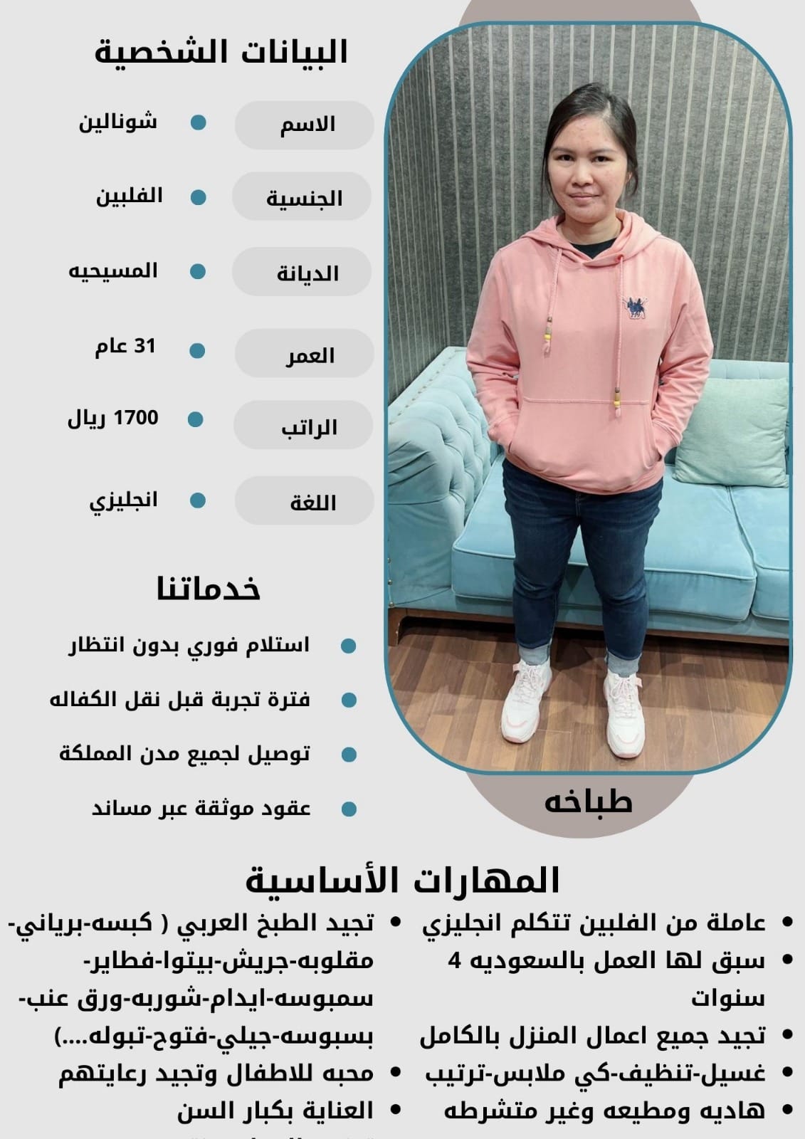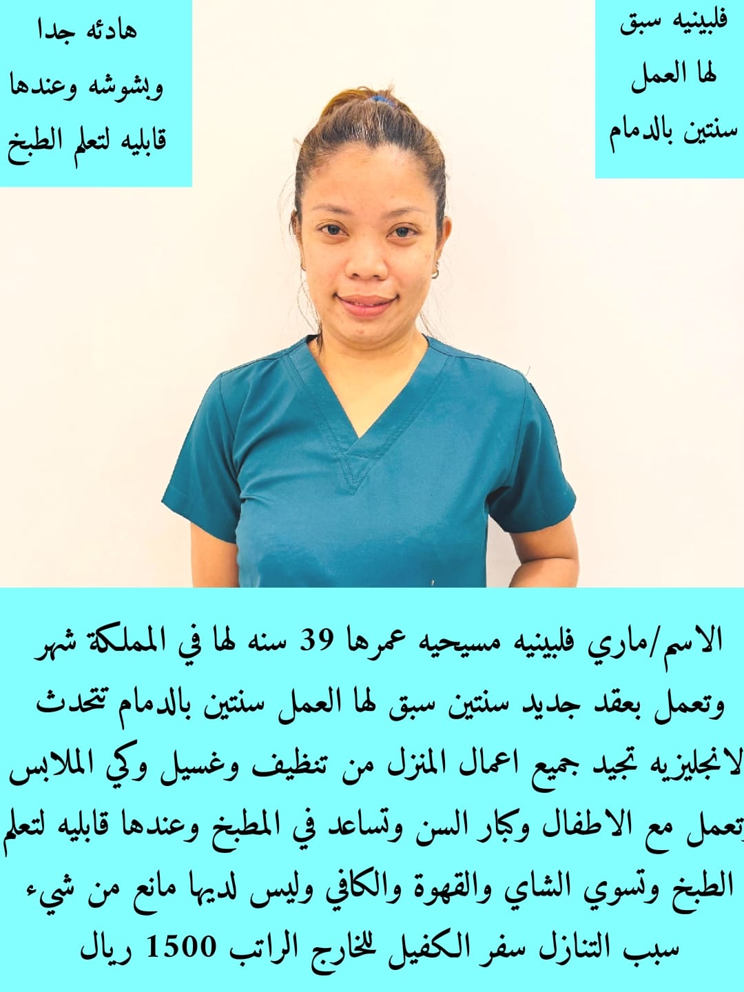 خادمه فلبينيه عمرها ٣١ تجيد مهام المنزل من تنظيف وترتيب وكوي ومساعده بالمطبخ تجيد التقطيع والحمسه والكشنه ولف السمبوسه وكذلك سريعة التعلم بالمطبخ ولديها الرغبه بالطبخ ممكن التواصل لارسال السي ڤي تجيد اللغه الانجليزيه وقليل من العربي
