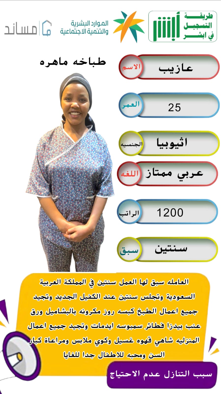 لوتيبي اثيوبيا مسلمة 26سنة طباخة ممتازةلها 6شهور وسبق لما العمل سنة وتجيد كافة الاكلات السعودي