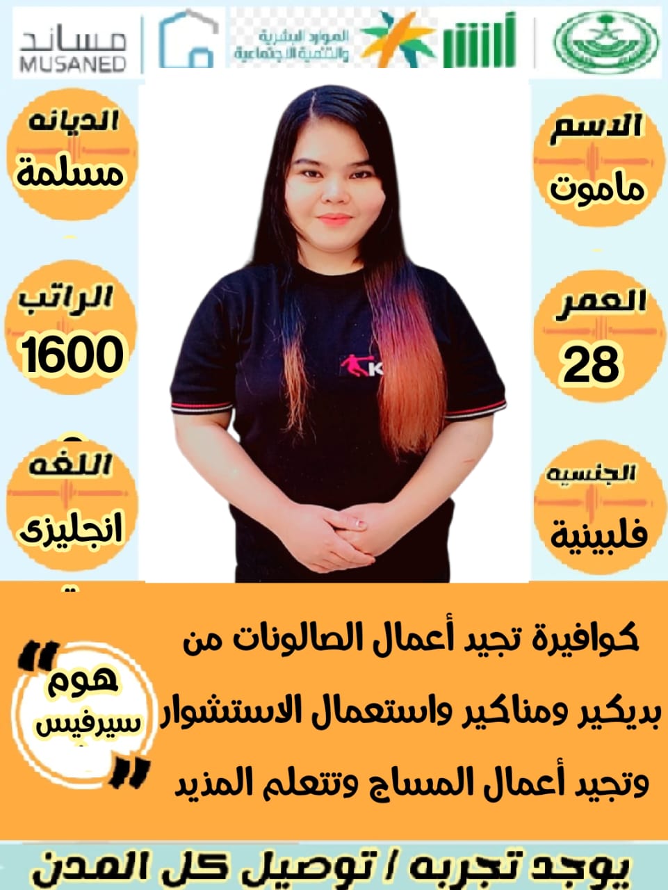 فلبينيه تجيد جميع اعمال المنزل وتعرف في البدكير و المناكير ٢٤سنه