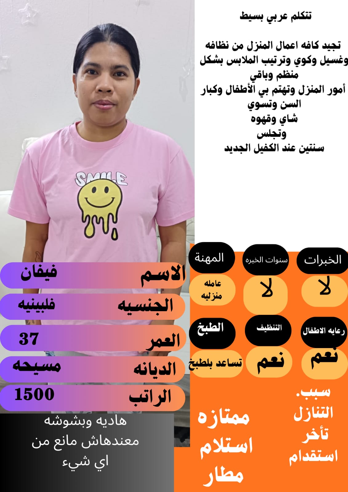 فلبينية ممتازة تجيد جميع اعمال المنزل سبق لها العمل بالكويت الراتب 1500