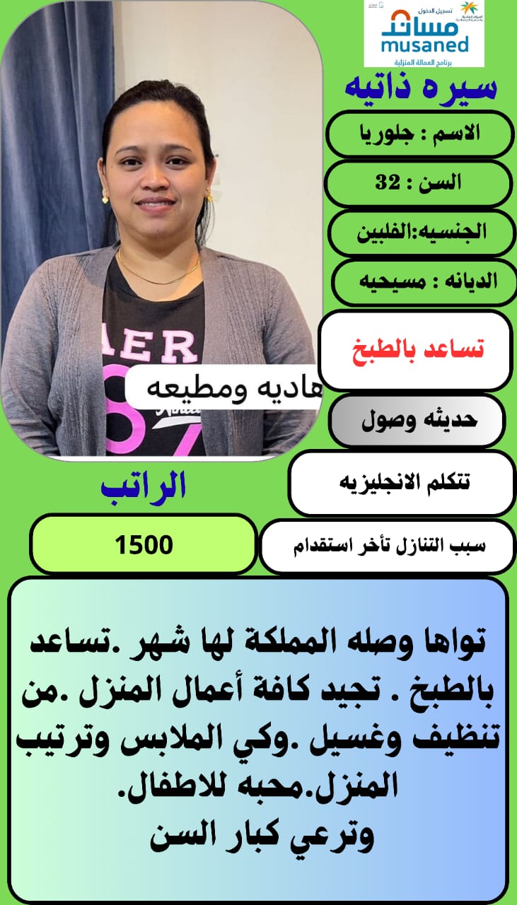 فلبينيه طباخه وممتاز في أعمال المنزل…