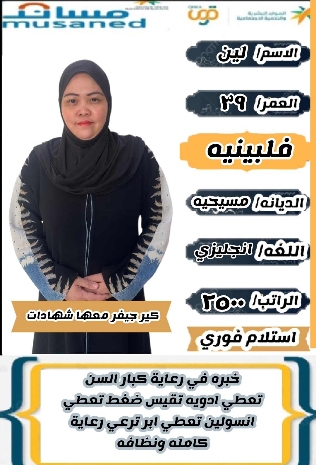 كير جيفر فلبينيه معها شهادات رعايه كبار سن تعطي ابر تقيس ضغط تعطي انسولين