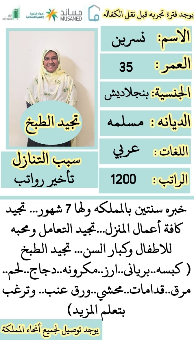 اندنسيا العمر 38 سبق لها العمل في ابو ظبي 3 و الدمام 5 سنوات تجيد بعض الطبخ