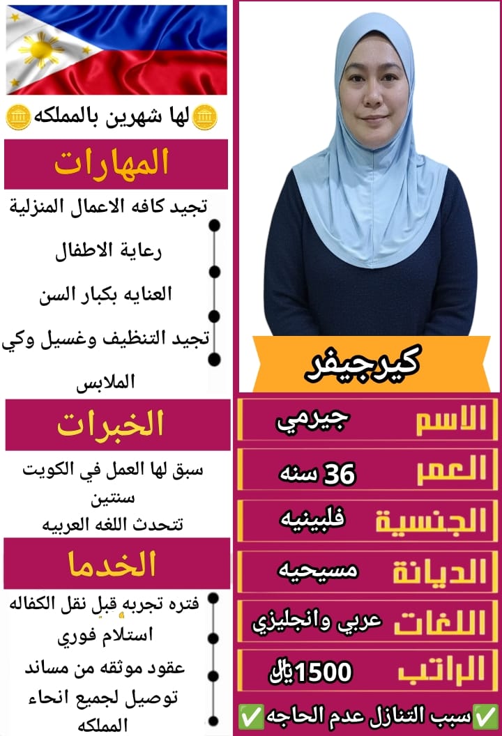 فلبينيه عمرها 40 راتبها 1500تجيد الطبخ السعودي وجميع الاعمال المنزليه محبه للاطفال وسبق لها العمل 6سنوات في السعوديه