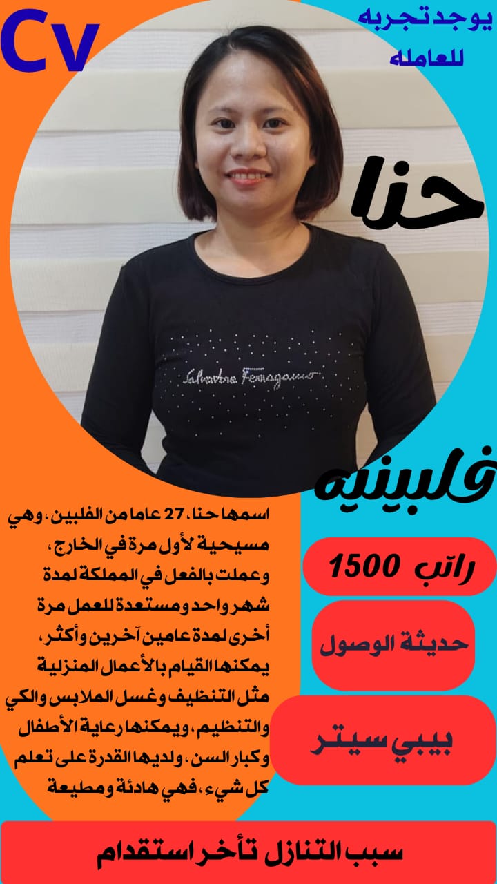 عامله فلبينيه حديث وصول تجد إعمال المنزل من ترتب وغسيل وتنظيف وكوي تجيد التعامل مع الأطفال وكبار السن