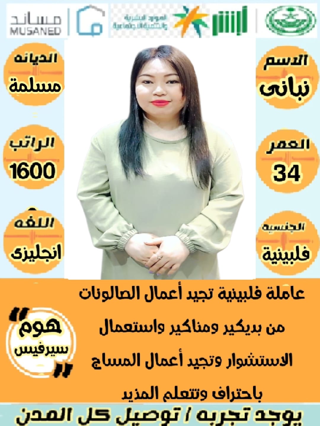فلبينيه تجيد جميع اعمال المنزل وتعرف في البدكير و المناكير ٢٤سنه