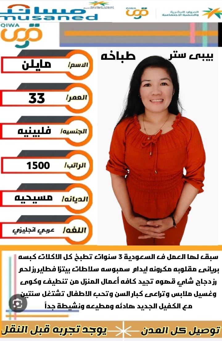 طباخه فلبينيه مسيحيه عمرها 41 حديثه وصول سبق لها العمل في الطائف 8 سنوات تجيد الطبخ السعودي تجيد جميع اعمال المنزل من ترتيب وتنظيف وغسيل وكي الملابس ومحبة للاطفال وترعي كبار السن
